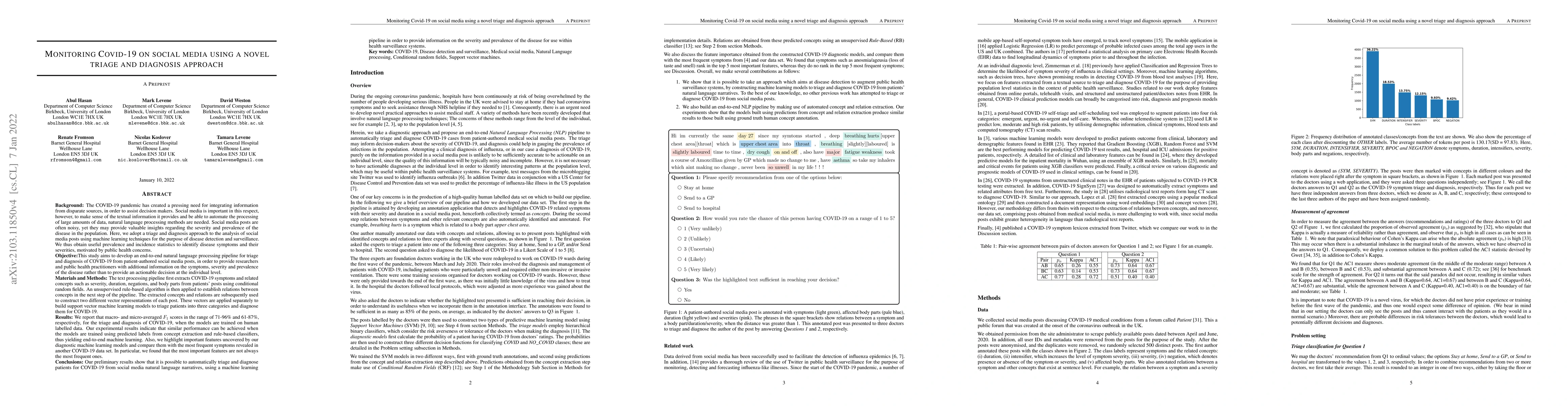 Objective: This study aims to develop an end-to-end natural language processing pipeline for triage and diagnosis of COVID-19 from patient-authored social media posts, in order to provide researchers and public health practitioners with additional information on the symptoms, severity and prevalence of the disease rather than to provide an actionable decision at the individual level. Materials and Methods: The text processing pipeline first extracts COVID-19 symptoms and related concepts such as severity, duration, negations, and body parts from patients' posts using conditional random fields. An unsupervised rule-based algorithm is then applied to establish relations between concepts in the next step of the pipeline. The extracted concepts and relations are subsequently used to construct two different vector representations of each post. These vectors are applied separately to build support vector machine learning models to triage patients into three categories and diagnose them for COVID-19. Results: We report that macro- and micro-averaged F1 scores in the range of 71-96% and 61-87%, respectively, for the triage and diagnosis of COVID-19, when the models are trained on human labelled data. Our experimental results indicate that similar performance can be achieved when the models are trained using predicted labels from concept extraction and rule-based classifiers, thus yielding end-to-end machine learning. Also, we highlight important features uncovered by our diagnostic machine learning models and compare them with the most frequent symptoms revealed in another COVID-19 dataset. In particular, we found that the most important features are not always the most frequent ones.