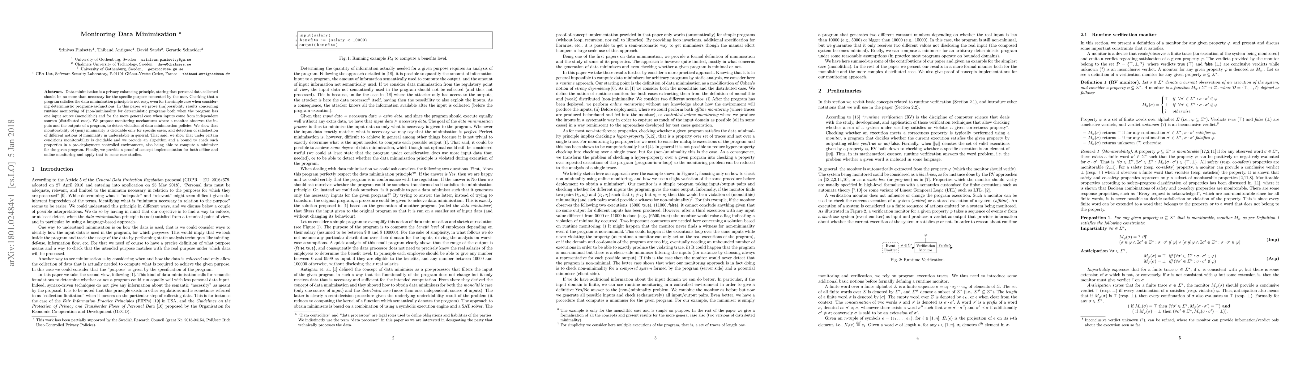 This paper investigates data minimisation in programming, proving impossibility for runtime monitoring of non-minimality in deterministic programs. It proposes a monitoring mechanism to detect violations and provides an algorithm to check properties in a pre-deployment environment.
