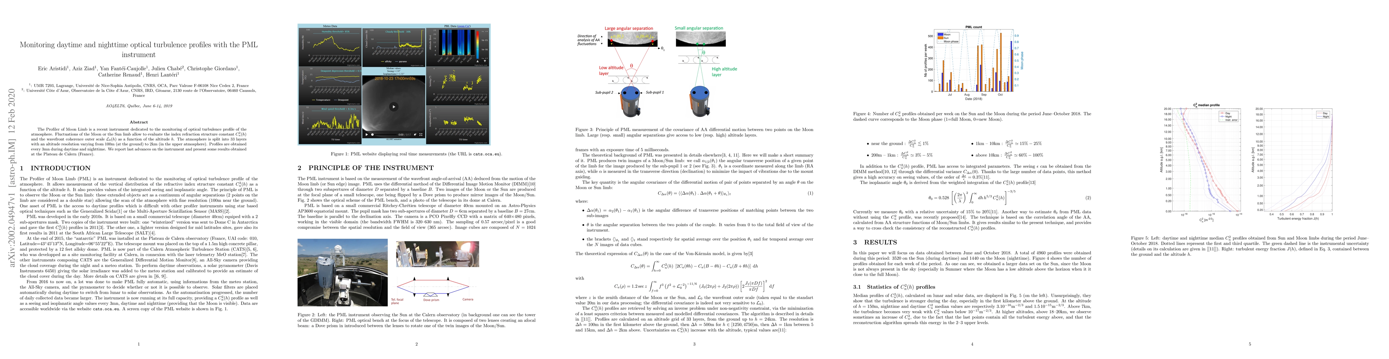 The Profiler of Moon Limb (PML) instrument monitors atmospheric optical turbulence profiles by evaluating the index refraction structure constant and coherence scale, with profiles obtained every 3 minutes during both day and night. Recent advances and initial results from the Plateau de Calern in France are reported.