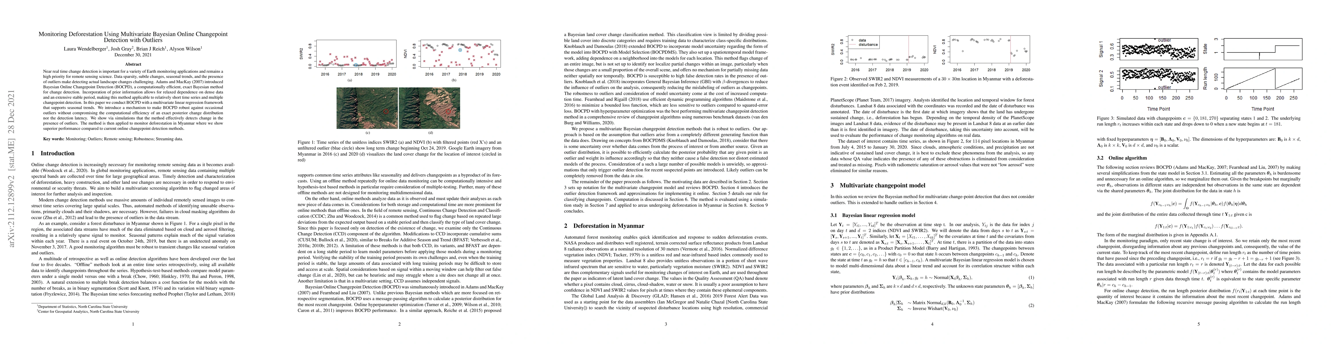 This paper proposes a multivariate Bayesian Online Changepoint Detection (BOCPD) method enhanced to handle outliers, applied to near real-time deforestation monitoring. The method effectively detects changes in the presence of outliers and demonstrates superior performance in monitoring deforestation in Myanmar compared to existing methods.