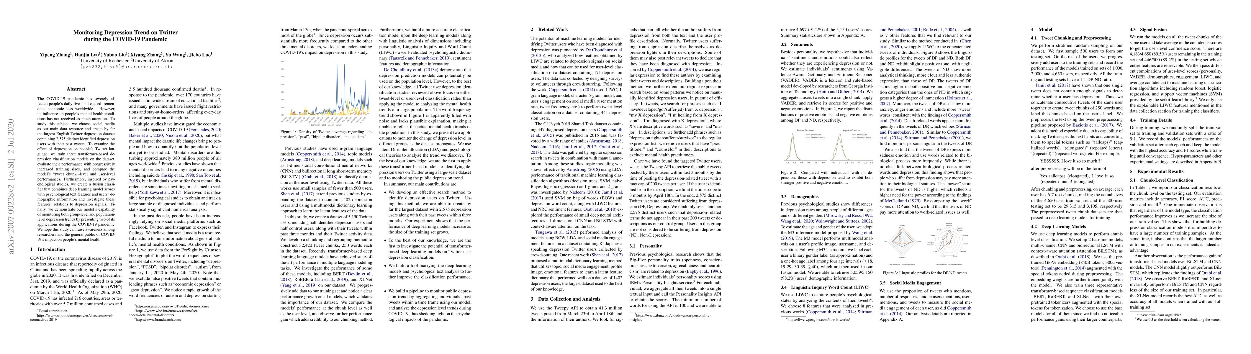 The COVID-19 pandemic has severely affected people's daily lives and caused tremendous economic loss worldwide. However, its influence on people's mental health conditions has not received as much attention. To study this subject, we choose social media as our main data resource and create by far the largest English Twitter depression dataset containing 2,575 distinct identified depression users with their past tweets. To examine the effect of depression on people's Twitter language, we train three transformer-based depression classification models on the dataset, evaluate their performance with progressively increased training sizes, and compare the model's "tweet chunk"-level and user-level performances. Furthermore, inspired by psychological studies, we create a fusion classifier that combines deep learning model scores with psychological text features and users' demographic information and investigate these features' relations to depression signals. Finally, we demonstrate our model's capability of monitoring both group-level and population-level depression trends by presenting two of its applications during the COVID-19 pandemic. We hope this study can raise awareness among researchers and the general public of COVID-19's impact on people's mental health.