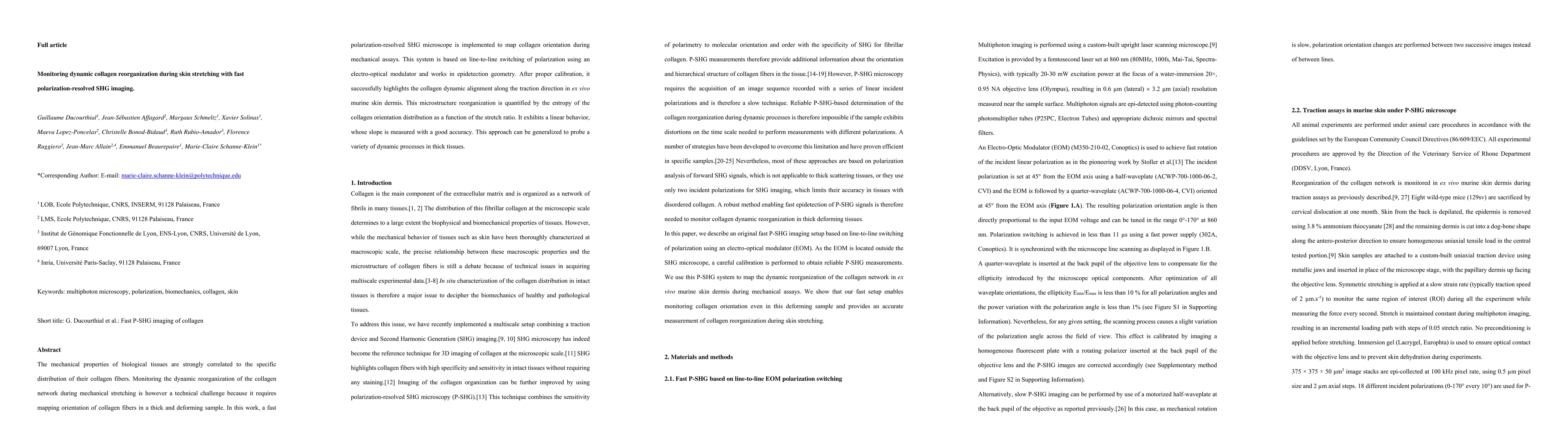 The mechanical properties of biological tissues are strongly correlated to the specific distribution of their collagen fibers. Monitoring the dynamic reorganization of the collagen network during mechanical stretching is however a technical challenge because it requires mapping orientation of collagen fibers in a thick and deforming sample. In this work, a fast polarization-resolved SHG microscope is implemented to map collagen orientation during mechanical assays. This system is based on line-to-line switching of polarization using an electro-optical modulator and works in epidetection geometry. After proper calibration, it successfully highlights the collagen dynamic alignment along the traction direction in ex vivo murine skin dermis. This microstructure reorganization is quantified by the entropy of the collagen orientation distribution as a function of the stretch ratio. It exhibits a linear behavior, whose slope is measured with a good accuracy. This approach can be generalized to probe a variety of dynamic processes in thick tissues.