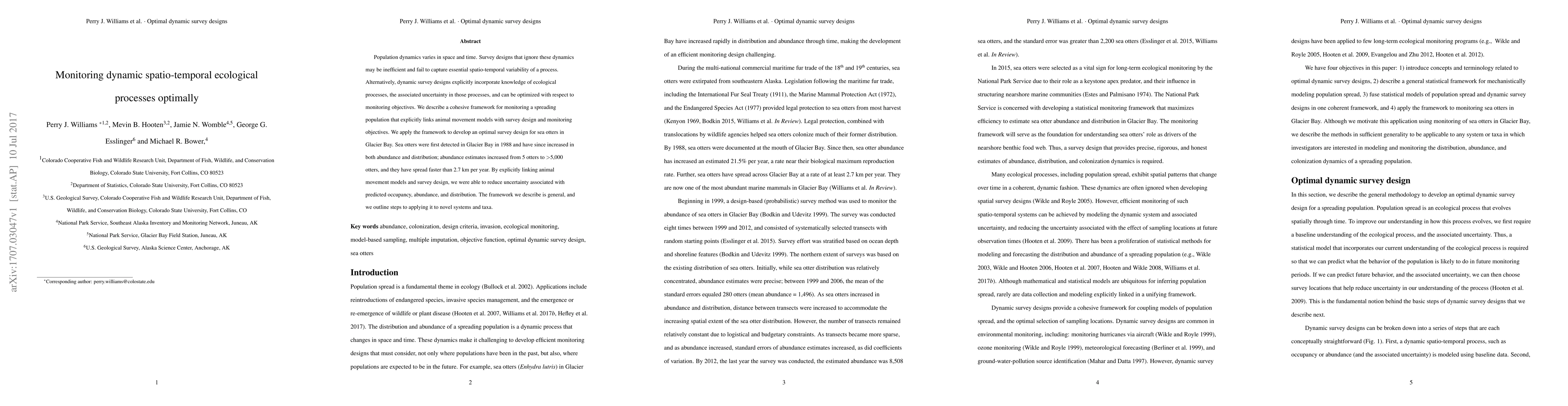 A framework is presented for monitoring spreading populations that links animal movement models with survey design and monitoring objectives, reducing uncertainty in predictions for sea otters in Glacier Bay.