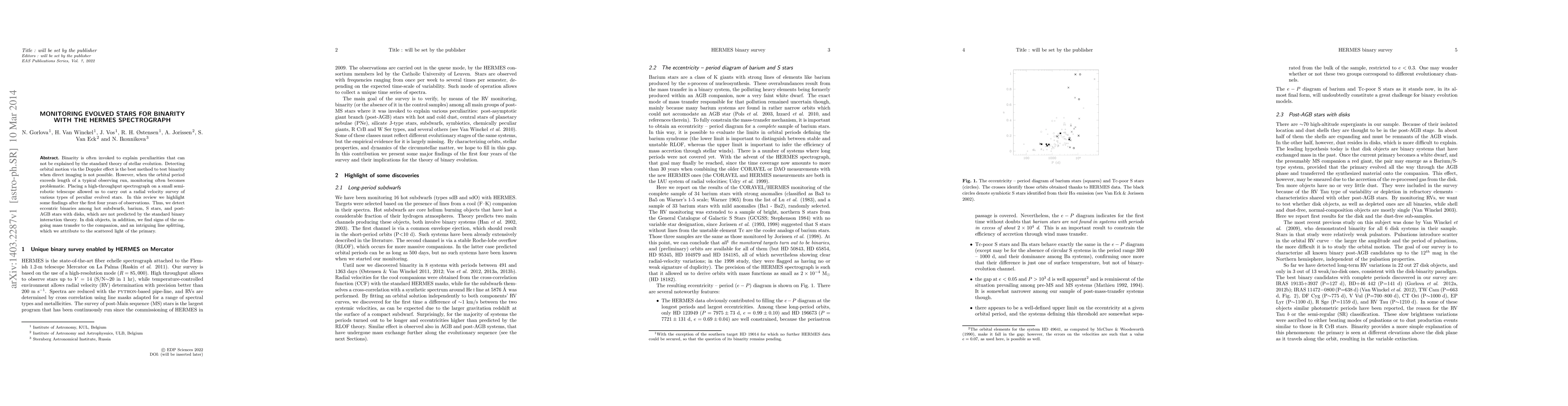 Binarity is often invoked to explain peculiarities that can not be explained by the standard theory of stellar evolution. Detecting orbital motion via the Doppler effect is the best method to test binarity when direct imaging is not possible. However, when the orbital period exceeds the duration of a typical observing run, monitoring often becomes problematic. Placing a high-throughput spectrograph on a small semi- robotic telescope allowed us to carry out a radial-velocity survey of various types of peculiar evolved stars. In this review we highlight some findings after the first four years of observations. Thus, we detect eccentric binaries among hot subdwarfs, barium, S stars, and post- AGB stars with disks, which are not predicted by the standard binary interaction theory. In disk objects, in addition, we find signs of the on- going mass transfer to the companion, and an intriguing line splitting, which we attribute to the scattered light of the primary.