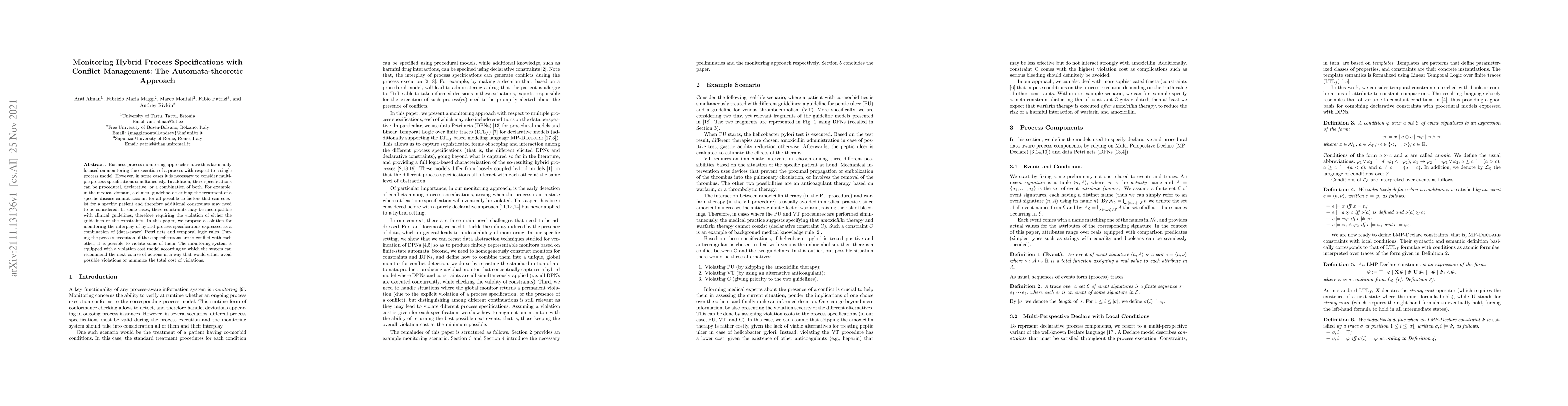 This paper proposes a monitoring system that can handle hybrid process specifications with potential conflicts, providing recommendations to minimize violations and total cost. It uses a combination of Petri nets and temporal logic rules to ensure effective conflict management.