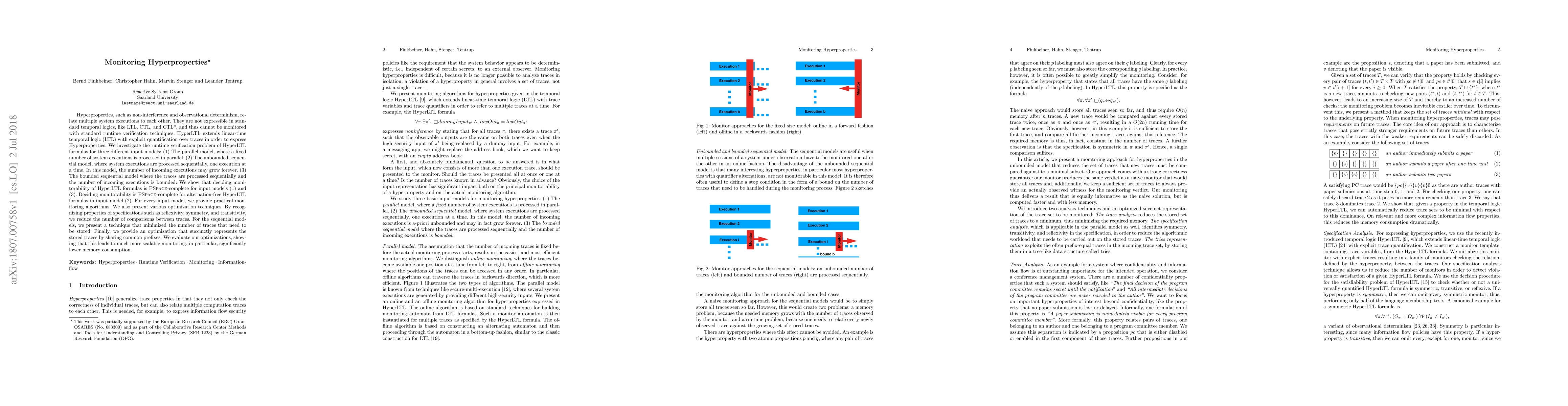 This paper investigates runtime verification of Hyperproperties using HyperLTL, which extends LTL to quantify over traces. It presents monitoring algorithms for three input models: parallel, unbounded sequential, and bounded sequential, showing that the monitorability problem is PSPACE-complete for the former two. The study also optimizes monitoring by reducing trace comparisons and minimizing memory usage through trace sharing techniques.