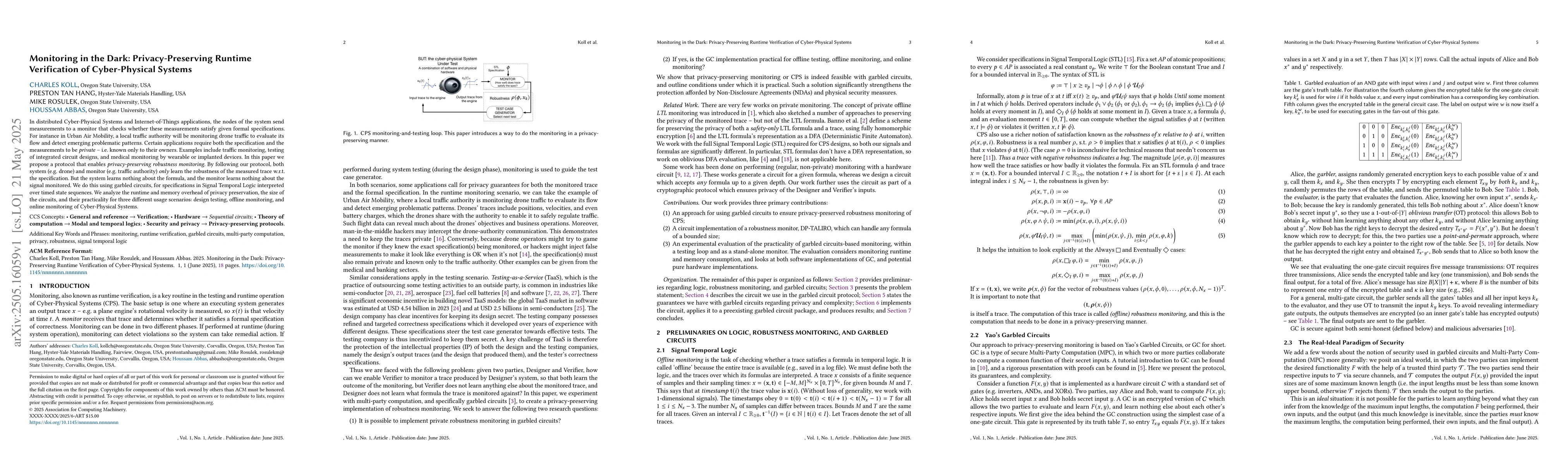 The paper proposes a protocol using garbled circuits for privacy-preserving runtime verification of Cyber-Physical Systems, specifically for specifications in Signal Temporal Logic interpreted over timed state sequences.
