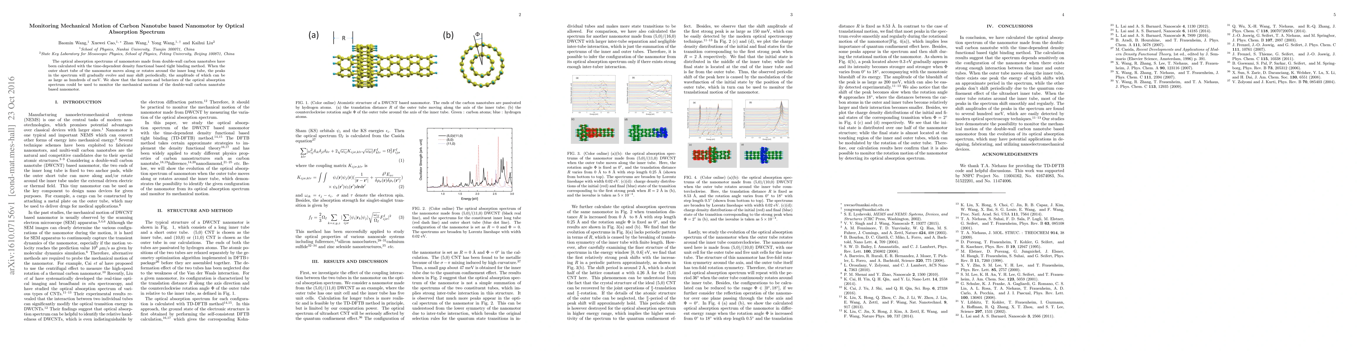 This study calculates the optical absorption spectrums of double-wall carbon nanotube nanomotors using time-dependent density functional theory. It reveals that mechanical motions, such as the movement or rotation of the outer tube around the inner tube, cause periodic shifts in the spectrum's peaks, enabling the monitoring of nanomotor activity via optical absorption.