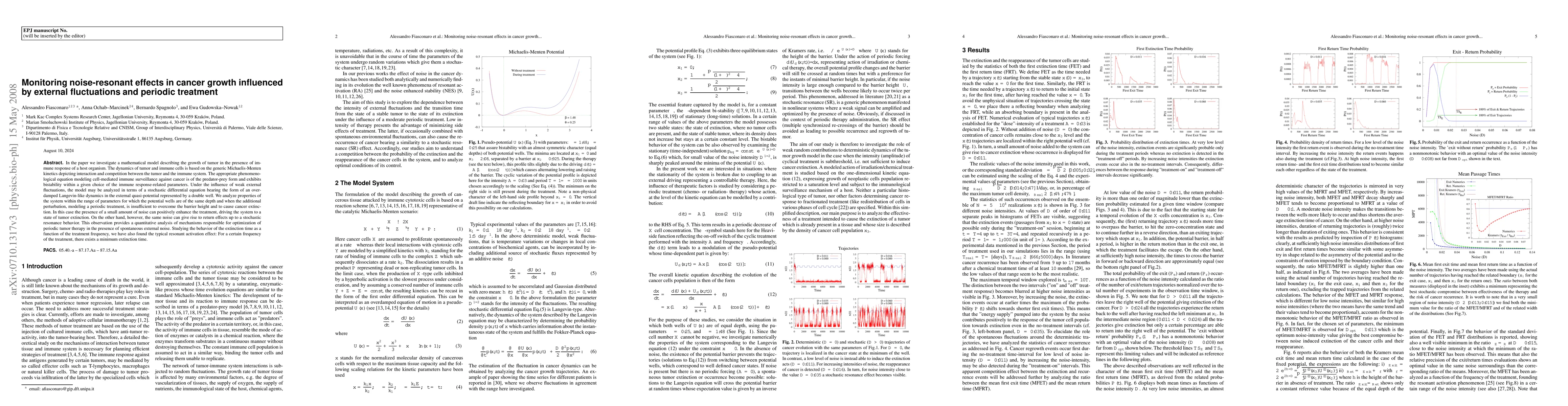 In the paper we investigate a mathematical model describing the growth of tumor in the presence of immune response of a host organism. The dynamics of tumor and immune cells is based on the generic Michaelis-Menten kinetics depicting interaction and competition between the tumor and the immune system. The appropriate phenomenological equation modeling cell-mediated immune surveillance against cancer is of the predator-prey form and exhibits bistability within a given choice of the immune response-related parameters. Under the influence of weak external fluctuations, the model may be analyzed in terms of a stochastic differential equation bearing the form of an overdamped Langevin-like dynamics in the external quasi-potential represented by a double well. We analyze properties of the system within the range of parameters for which the potential wells are of the same depth and when the additional perturbation, modeling a periodic treatment, is insufficient to overcome the barrier height and to cause cancer extinction. In this case the presence of a small amount of noise can positively enhance the treatment, driving the system to a state of tumor extinction. On the other hand, however, the same noise can give rise to return effects up to a stochastic resonance behavior. This observation provides a quantitative analysis of mechanisms responsible for optimization of periodic tumor therapy in the presence of spontaneous external noise. Studying the behavior of the extinction time as a function of the treatment frequency, we have also found the typical resonant activation effect: For a certain frequency of the treatment, there exists a minimum extinction time.