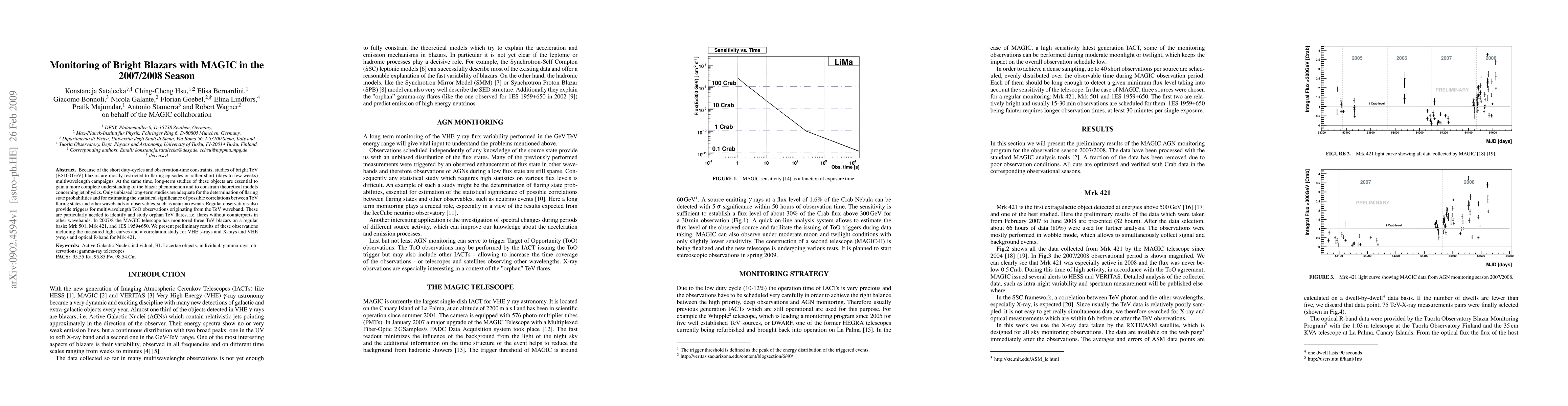 Because of the short duty-cycles and observation-time constraints, studies of bright TeV (E>100 GeV) blazars are mostly restricted to flaring episodes or rather short (days to few weeks) multiwavelength campaigns. At the same time, long-term studies of these objects are essential to gain a more complete understanding of the blazar phenomenon and to constrain theoretical models concerning jet physics. Only unbiased long-term studies are adequate for the determination of flaring state probabilities and for estimating the statistical significance of possible correlations between TeV flaring states and other wavebands or observables, such as neutrino events. Regular observations also provide triggers for multiwavelength ToO observations originating from the TeV waveband. These are particularly needed to identify and study orphan TeV flares, i.e. flares without counterparts in other wavebands. In 2007/8 the MAGIC telescope has monitored three TeV blazars on a regular basis: Mrk 501, Mrk 421, and 1ES 1959+650. We present preliminary results of these observations including the measured light curves and a correlation study for VHE gamma-rays and X-rays and VHE gamma-rays and optical R-band for Mrk 421.