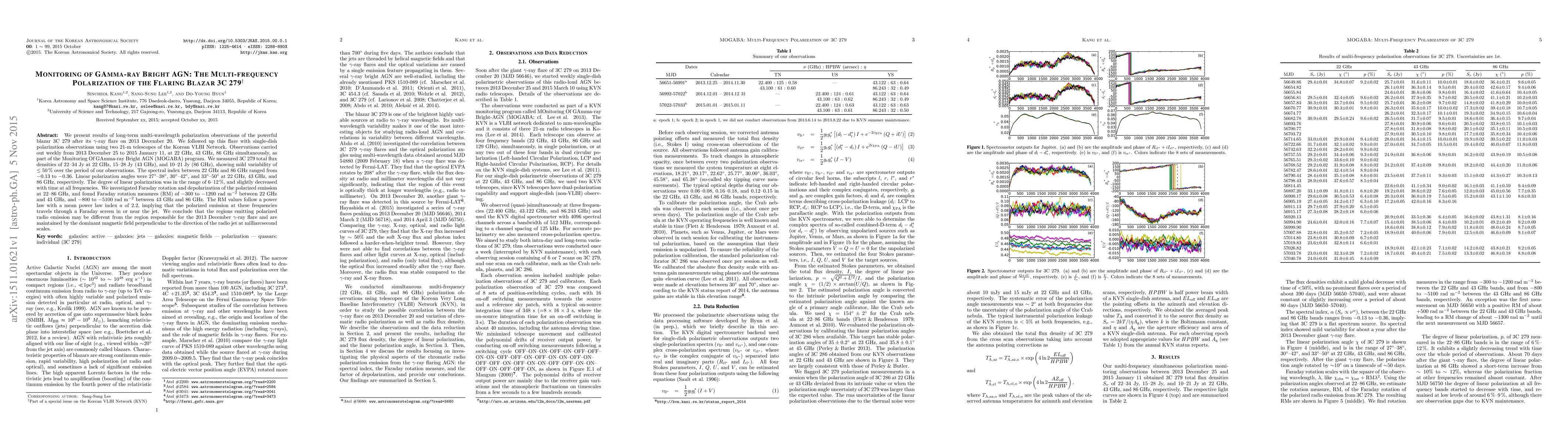 We present results of long-term multi-wavelength polarization observations of the powerful blazar 3C~279 after its $\gamma$-ray flare on 2013~December 20. We followed up this flare with single-dish polarization observations using two 21-m telescopes of the Korean VLBI Network. Observations carried out weekly from 2013~December~25 to 2015~January~11, at 22~GHz, 43~GHz, 86~GHz simultaneously, as part of the Monitoring Of GAmma-ray Bright AGN (MOGABA) program. We measured 3C~279 total flux densities of 22--34~Jy at 22~GHz, 15--28~Jy (43~GHz), and 10--21~Jy (86~GHz), showing mild variability of $\leq 50\,\%$ over the period of our observations. The spectral index between 22~GHz and 86~GHz ranged from $-0.13$ to $-0.36$. Linear polarization angles were 27$^{\circ}$--38$^{\circ}$, 30$^{\circ}$--42$^{\circ}$, and 33$^{\circ}$--50$^{\circ}$ at 22~GHz, 43~GHz, and 86~GHz, respectively. The degree of linear polarization was in the range of 6--12\,\%, and slightly decreased with time at all frequencies. We investigated Faraday rotation and depolarization of the polarized emission at 22--86~GHz, and found Faraday rotation measures (RM) of $-300$ to $-1200$~rad~m$^{-2}$ between 22~GHz and 43~GHz, and $-800$ to $-5100$~rad~m$^{-2}$ between 43~GHz and 86~GHz. The RM values follow a power law with a mean power law index $a$ of $2.2$, implying that the polarized emission at these frequencies travels through a Faraday screen in or near the jet. We conclude that the regions emitting polarized radio emission may be different from the region responsible for the 2013 December $\gamma$-ray flare and are maintained by the dominant magnetic field perpendicular to the direction of the radio jet at milliarcsecond scales.