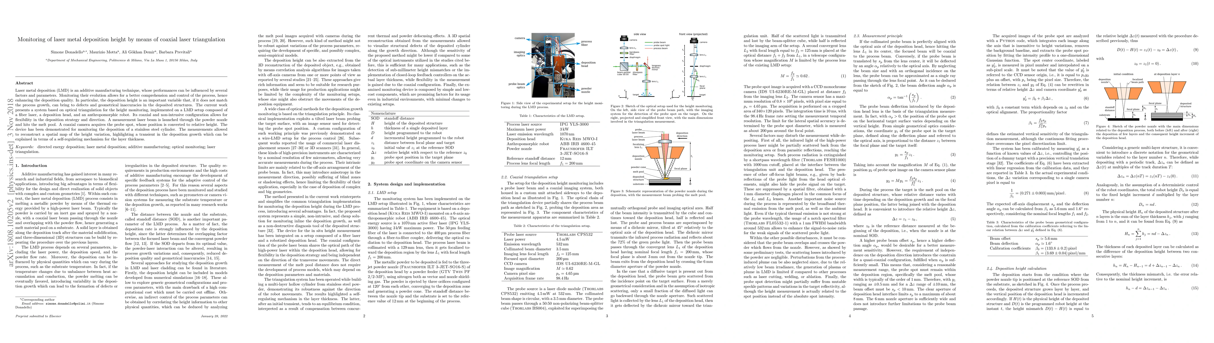 Laser metal deposition (LMD) is an additive manufacturing technique, whose performances can be influenced by several factors and parameters. Monitoring their evolution allows for a better comprehension and control of the process, hence enhancing the deposition quality. In particular, the deposition height is an important variable that, if it does not match the process growth, can bring to defects and geometrical inaccuracies in the deposited structures. The current work presents a system based on optical triangulation for the height monitoring, implemented on a LMD setup composed of a fiber laser, a deposition head, and an anthropomorphic robot. Its coaxial and non-intrusive configuration allows for flexibility in the deposition strategy and direction. A measurement laser beam is launched through the powder nozzle and hits the melt pool. A coaxial camera acquires the probe spot, whose position is converted to relative height. The device has been demonstrated for monitoring the deposition of a stainless steel cylinder. The measurements allowed to reconstruct a spatial map of the height variation, highlighting a transient in the deposition growth which can be explained in terms of a self-regulating mechanism for the layer thickness.