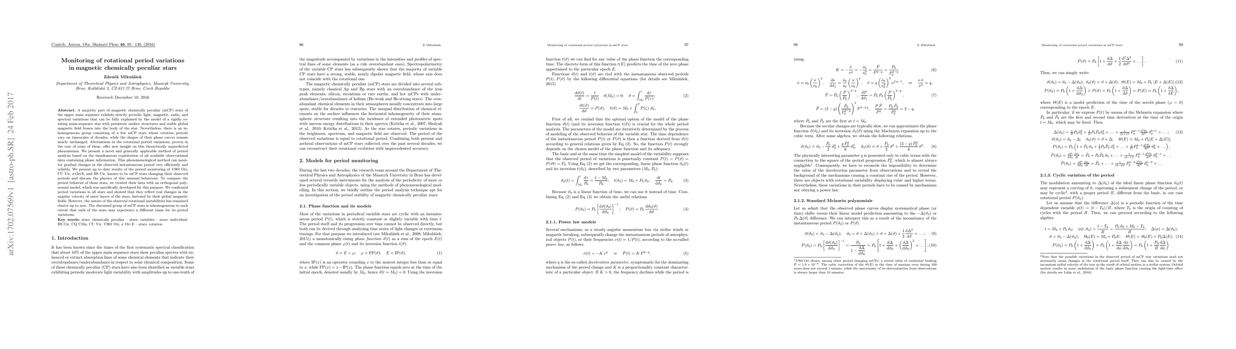 A majority part of magnetic chemically peculiar (mCP) stars of the upper main sequence exhibits strictly periodic light, magnetic, radio, and spectral variations that can be fully explained by the model of a rigidly rotating main-sequence star with persistent surface structures and stable global magnetic field frozen into the body of the star. Nevertheless, there is an inhomogeneous group consisting of a few mCP stars whose rotation periods vary on timescales of decades, while the shapes of their phase curves remain nearly unchanged. Alternations in the rotational period variations, proven in the case of some of them, offer new insight on this theoretically unpredicted phenomenon. We present a novel and generally applicable method of period analysis based on the simultaneous exploitation of all available observational data containing phase information. This phenomenological method can monitor gradual changes in the observed instantaneous period very efficiently and reliably. We present up to date results of the period monitoring of V901~Ori, CU~Vir, $\sigma$\,Ori\,E, and BS~Cir, known to be mCP stars changing their observed periods and discuss the physics of this unusual behaviour. To compare the period behavior of those stars, we treated their data with an orthogonal polynomial model, which was specifically developed for this purpose. We confirmed period variations in all stars and showed that they reflect real changes in the angular velocity of outer layers of the stars, fastened by their global magnetic fields. However, the nature of the observed rotational instabilities has remained elusive up to now. The discussed group of mCP stars is inhomogeneous to such extent that each of the stars may experience a different cause for its period variations.