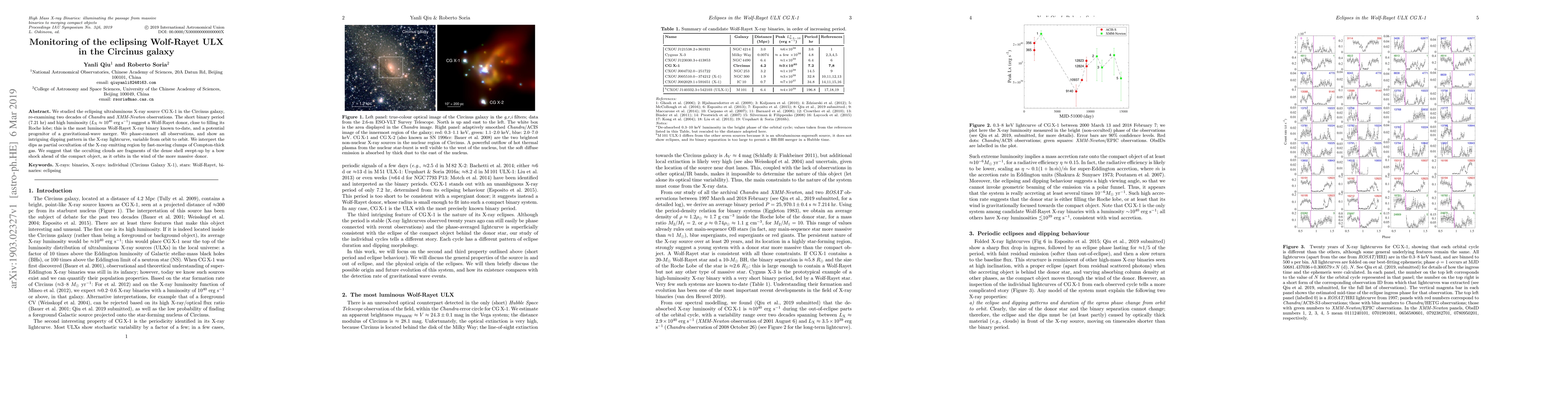This study monitors the eclipsing ultraluminous X-ray source CG X-1 in the Circinus galaxy, revealing a dipping pattern in its X-ray lightcurve likely due to partial occultation by fast-moving clumps of Compton-thick gas. The source is identified as the most luminous Wolf-Rayet X-ray binary, suggesting it may be a progenitor of a gravitational-wave merger.