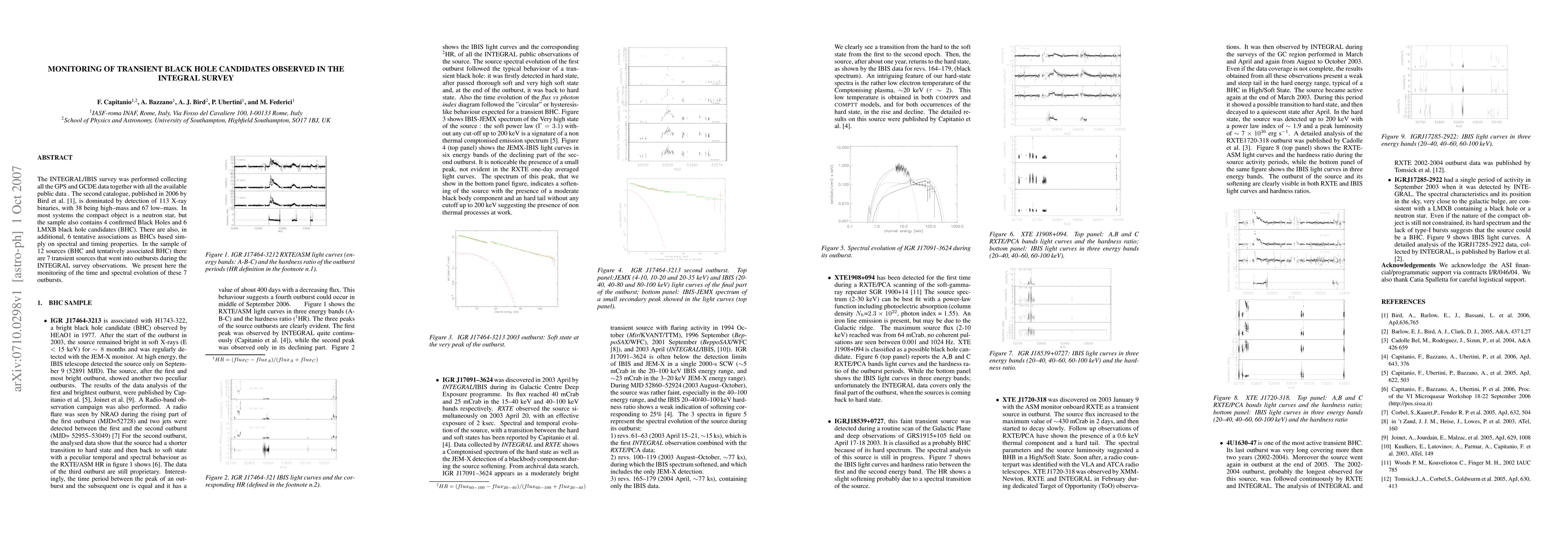 The INTEGRAL/IBIS survey was performed collecting all the GPS and GCDE data together with all the available public data . The second catalogue, published in 2006 by Bird et al., is dominated by detection of 113 X-ray binaries, with 38 being high-mass and 67 low-mass. In most systems the compact object is a neutron star, but the sample also contains 4 confirmed Black Holes and 6 LMXB black hole candidates (BHC). There are also, in additional, 6 tentative associations as BHCs based simply on spectral and timing properties. In the sample of 12 sources (BHC and tentatively associated BHC) there are 7 transient sources that went into outbursts during the INTEGRAL survey observations. We present here the monitoring of the time and spectral evolution of these 7 outbursts.
