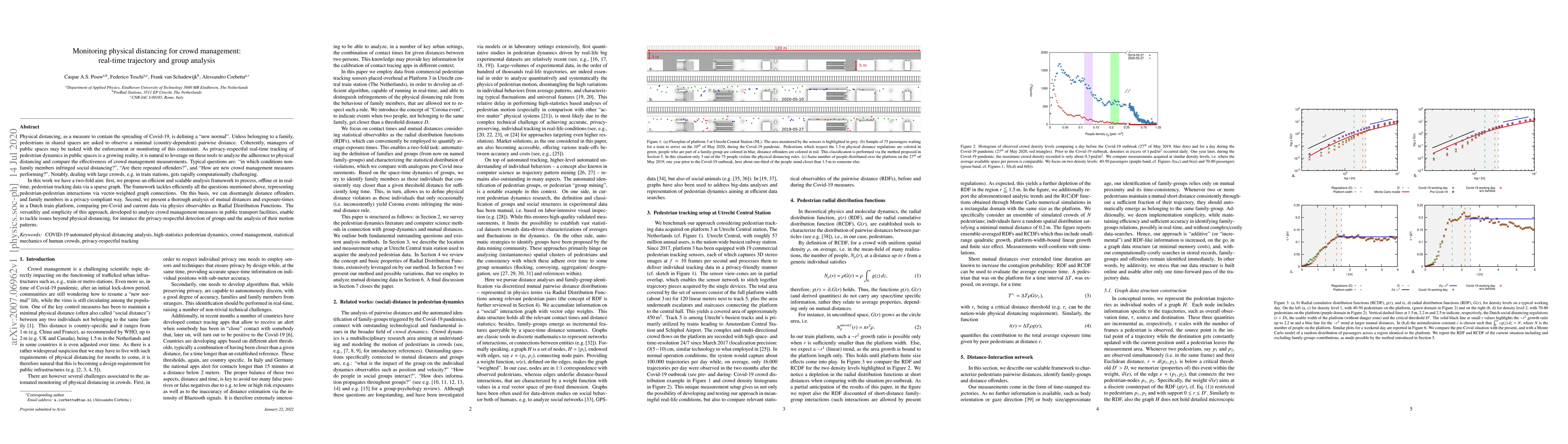 Physical distancing, as a measure to contain the spreading of Covid-19, is defining a "new normal". Unless belonging to a family, pedestrians in shared spaces are asked to observe a minimal (country-dependent) pairwise distance. Coherently, managers of public spaces may be tasked with the enforcement or monitoring of this constraint. As privacy-respectful real-time tracking of pedestrian dynamics in public spaces is a growing reality, it is natural to leverage on these tools to analyze the adherence to physical distancing and compare the effectiveness of crowd management measurements. Typical questions are: "in which conditions non-family members infringed social distancing?", "Are there repeated offenders?", and "How are new crowd management measures performing?". Notably, dealing with large crowds, e.g. in train stations, gets rapidly computationally challenging. In this work we have a two-fold aim: first, we propose an efficient and scalable analysis framework to process, offline or in real-time, pedestrian tracking data via a sparse graph. The framework tackles efficiently all the questions mentioned above, representing pedestrian-pedestrian interactions via vector-weighted graph connections. On this basis, we can disentangle distance offenders and family members in a privacy-compliant way. Second, we present a thorough analysis of mutual distances and exposure-times in a Dutch train platform, comparing pre-Covid and current data via physics observables as Radial Distribution Functions. The versatility and simplicity of this approach, developed to analyze crowd management measures in public transport facilities, enable to tackle issues beyond physical distancing, for instance the privacy-respectful detection of groups and the analysis of their motion patterns.