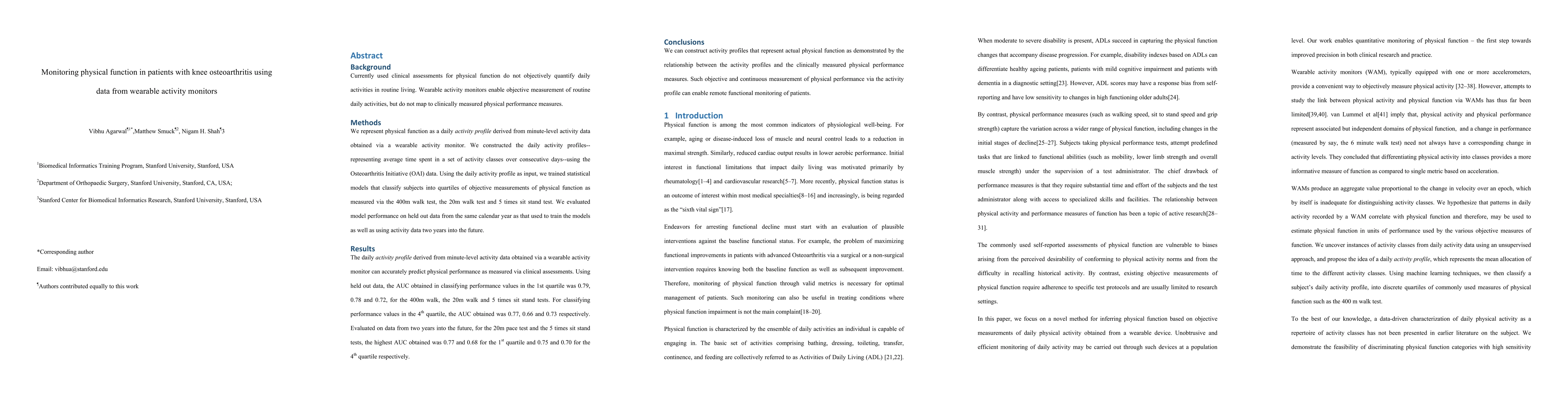 A study used wearable activity monitors to create daily activity profiles for patients with knee osteoarthritis, which predicted their physical function based on clinical assessments. The results showed promising accuracy in predicting physical performance using the activity profiles.