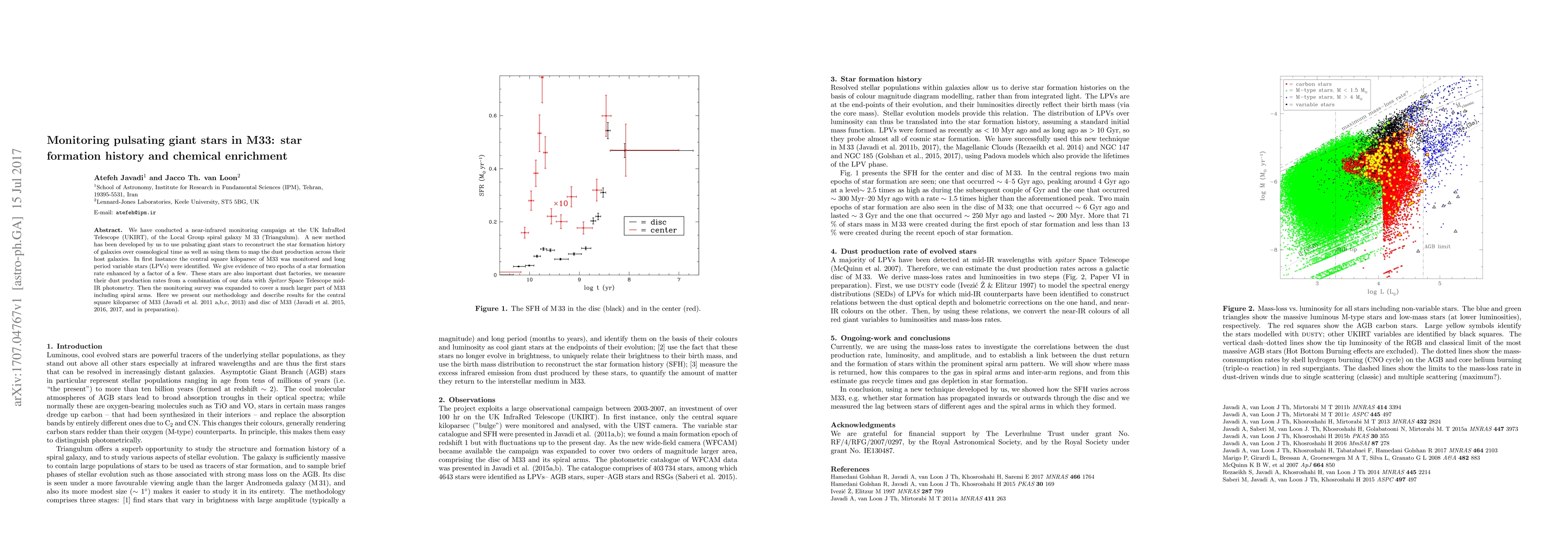 We have conducted a near-infrared monitoring campaign at the UK InfraRed Telescope (UKIRT), of the Local Group spiral galaxy M 33 (Triangulum). A new method has been developed by us to use pulsating giant stars to reconstruct the star formation history of galaxies over cosmological time as well as using them to map the dust production across their host galaxies. In first Instance the central square kiloparsec of M33 was monitored and long period variable stars (LPVs) were identified. We give evidence of two epochs of a star formation rate enhanced by a factor of a few. These stars are also important dust factories, we measure their dust production rates from a combination of our data with Spitzer Space Telescope mid-IR photometry. Then the monitoring survey was expanded to cover a much larger part of M33 including spiral arms. Here we present our methodology and describe results for the central square kiloparsec of M33 (Javadi et al. 2011 a,b,c, 2013) and disc of M33 (Javadi et al. 2015, 2016, 2017, and in preparation).