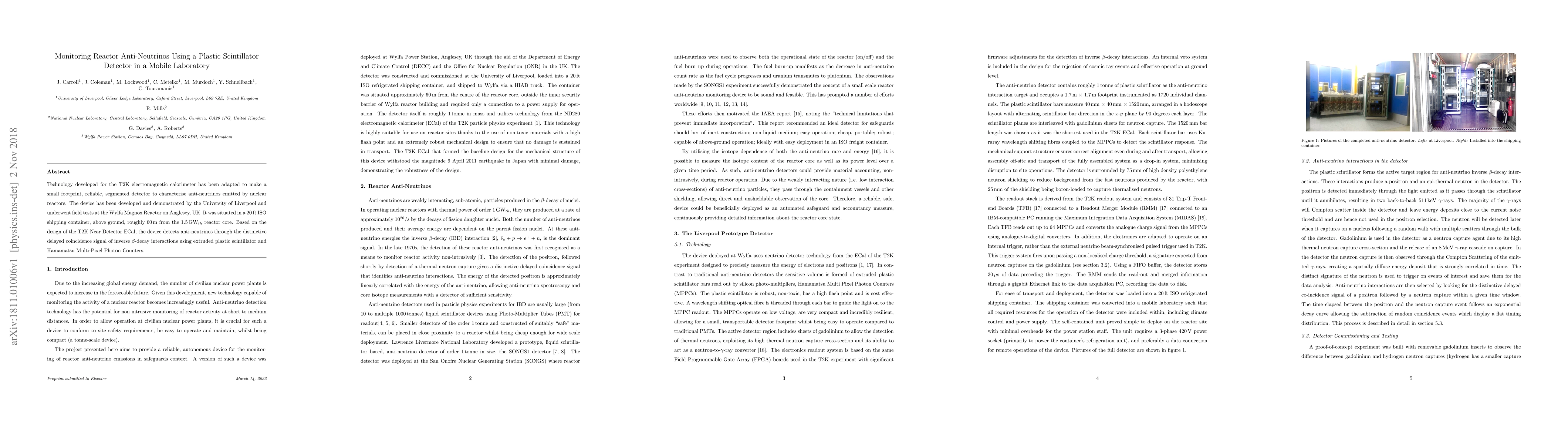 Technology developed for the T2K electromagnetic calorimeter has been adapted to make a small footprint, reliable, segmented detector to characterise anti-neutrinos emitted by nuclear reactors. The device has been developed and demonstrated by the University of Liverpool and underwent field tests at the Wylfa Magnox Reactor on Anglesey, UK. It was situated in a 20\,ft ISO shipping container, above ground, roughly 60\,m from the 1.5\,\GWt\ reactor core. Based on the design of the T2K Near Detector ECal, the device detects anti-neutrinos through the distinctive delayed coincidence signal of inverse $\beta$-decay interactions using extruded plastic scintillator and Hamamatsu Multi-Pixel Photon Counters.