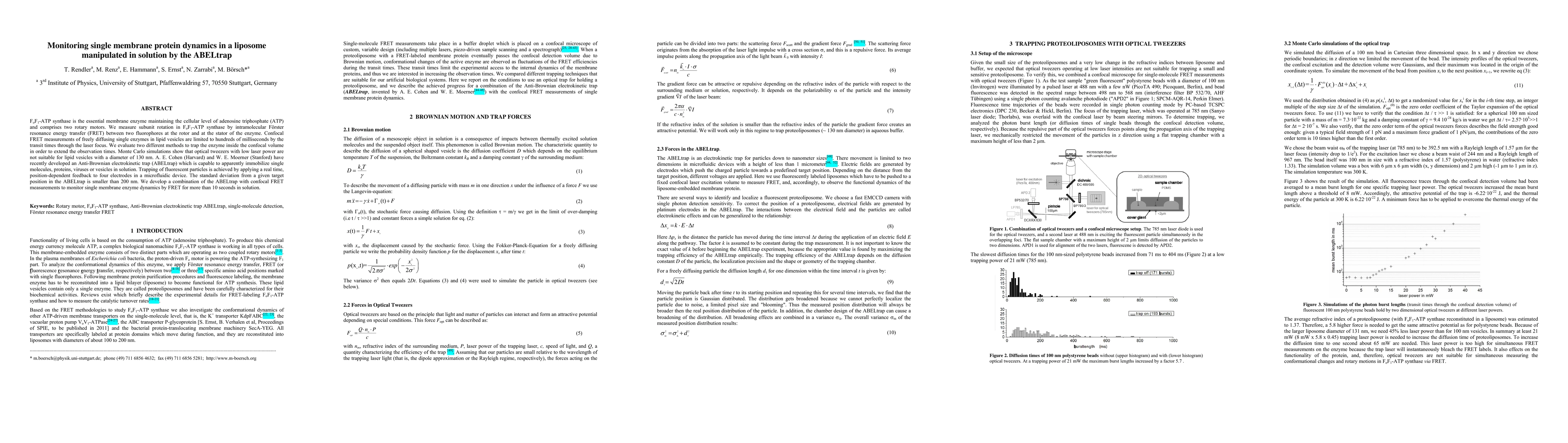 FoF1-ATP synthase is the essential membrane enzyme maintaining the cellular level of adenosine triphosphate (ATP) and comprises two rotary motors. We measure subunit rotation in FoF1-ATP synthase by intramolecular Foerster resonance energy transfer (FRET) between two fluorophores at the rotor and at the stator of the enzyme. Confocal FRET measurements of freely diffusing single enzymes in lipid vesicles are limited to hundreds of milliseconds by the transit times through the laser focus. We evaluate two different methods to trap the enzyme inside the confocal volume in order to extend the observation times. Monte Carlo simulations show that optical tweezers with low laser power are not suitable for lipid vesicles with a diameter of 130 nm. A. E. Cohen (Harvard) and W. E. Moerner (Stanford) have recently developed an Anti-Brownian electrokinetic trap (ABELtrap) which is capable to apparently immobilize single molecules, proteins, viruses or vesicles in solution. Trapping of fluorescent particles is achieved by applying a real time, position-dependent feedback to four electrodes in a microfluidic device. The standard deviation from a given target position in the ABELtrap is smaller than 200 nm. We develop a combination of the ABELtrap with confocal FRET measurements to monitor single membrane enzyme dynamics by FRET for more than 10 seconds in solution.