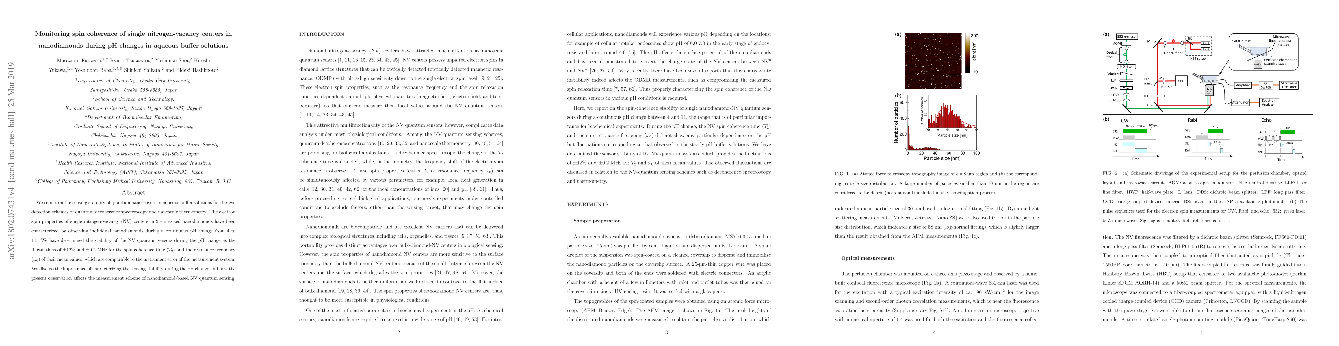 Researchers studied the stability of nanodiamond quantum sensors with nitrogen-vacancy centers when exposed to varying pH levels, finding fluctuations in spin coherence time and resonance frequency, which could impact their sensing capabilities.