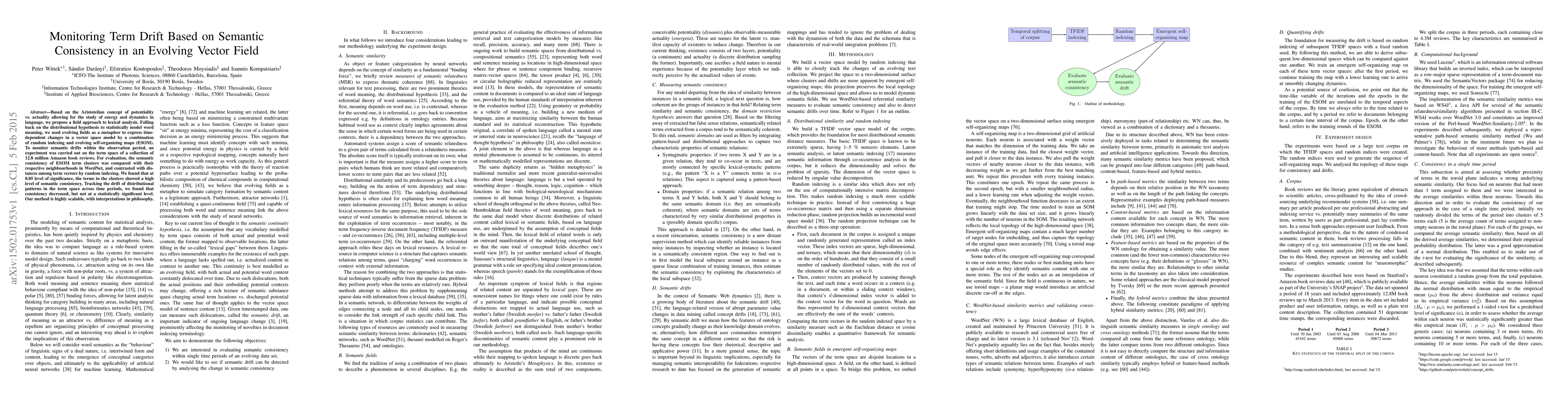 Based on the Aristotelian concept of potentiality vs. actuality allowing for the study of energy and dynamics in language, we propose a field approach to lexical analysis. Falling back on the distributional hypothesis to statistically model word meaning, we used evolving fields as a metaphor to express time-dependent changes in a vector space model by a combination of random indexing and evolving self-organizing maps (ESOM). To monitor semantic drifts within the observation period, an experiment was carried out on the term space of a collection of 12.8 million Amazon book reviews. For evaluation, the semantic consistency of ESOM term clusters was compared with their respective neighbourhoods in WordNet, and contrasted with distances among term vectors by random indexing. We found that at 0.05 level of significance, the terms in the clusters showed a high level of semantic consistency. Tracking the drift of distributional patterns in the term space across time periods, we found that consistency decreased, but not at a statistically significant level. Our method is highly scalable, with interpretations in philosophy.