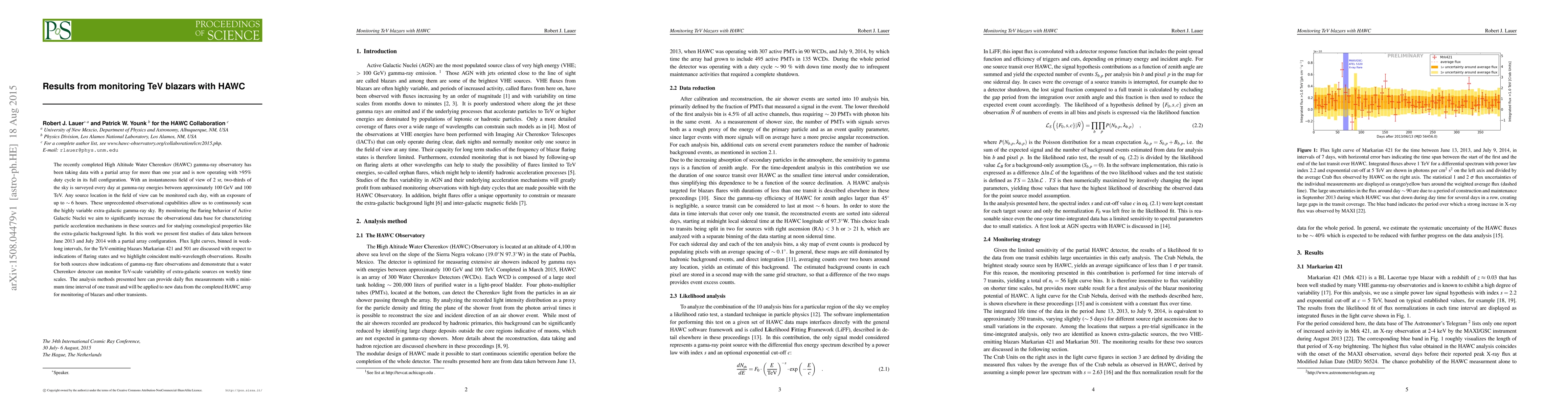 The HAWC observatory has been monitoring TeV blazars, including Markarian 421 and 501, revealing weekly-scale gamma-ray flares and demonstrating the capability to track TeV-scale variability. These findings enhance our understanding of particle acceleration and cosmological properties.