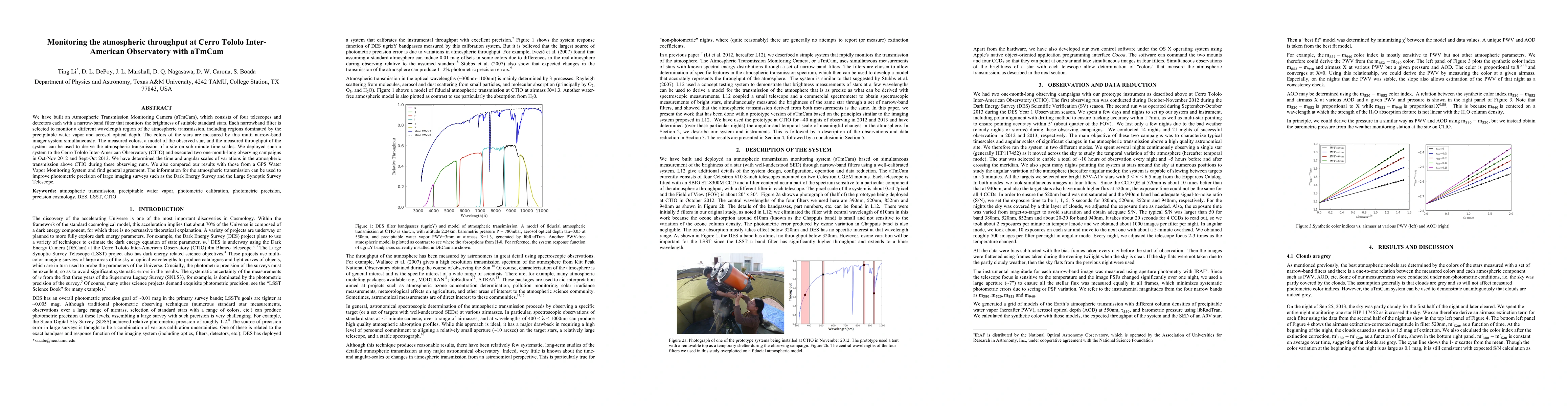 We have built an Atmospheric Transmission Monitoring Camera (aTmCam), which consists of four telescopes and detectors each with a narrow-band filter that monitors the brightness of suitable standard stars. Each narrowband filter is selected to monitor a different wavelength region of the atmospheric transmission, including regions dominated by the precipitable water vapor and aerosol optical depth. The colors of the stars are measured by this multi narrow-band imager system simultaneously. The measured colors, a model of the observed star, and the measured throughput of the system can be used to derive the atmospheric transmission of a site on sub-minute time scales. We deployed such a system to the Cerro Tololo Inter-American Observatory (CTIO) and executed two one-month-long observing campaigns in Oct-Nov 2012 and Sept-Oct 2013. We have determined the time and angular scales of variations in the atmospheric transmission above CTIO during these observing runs. We also compared our results with those from a GPS Water Vapor Monitoring System and find general agreement. The information for the atmospheric transmission can be used to improve photometric precision of large imaging surveys such as the Dark Energy Survey and the Large Synoptic Survey Telescope.