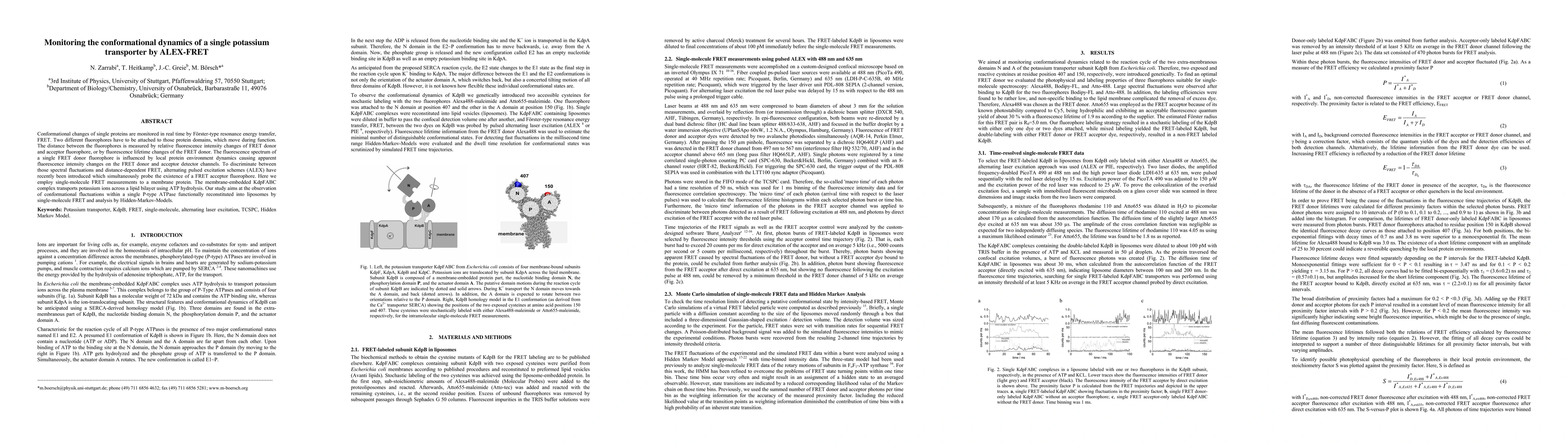 This paper employs single-molecule FRET and ALEX-FRET to monitor conformational dynamics of a single potassium transporter (KdpFABC complex) in real time. The study aims to observe conformational fluctuations within the P-type ATPase using Hidden-Markov-Models for analysis.