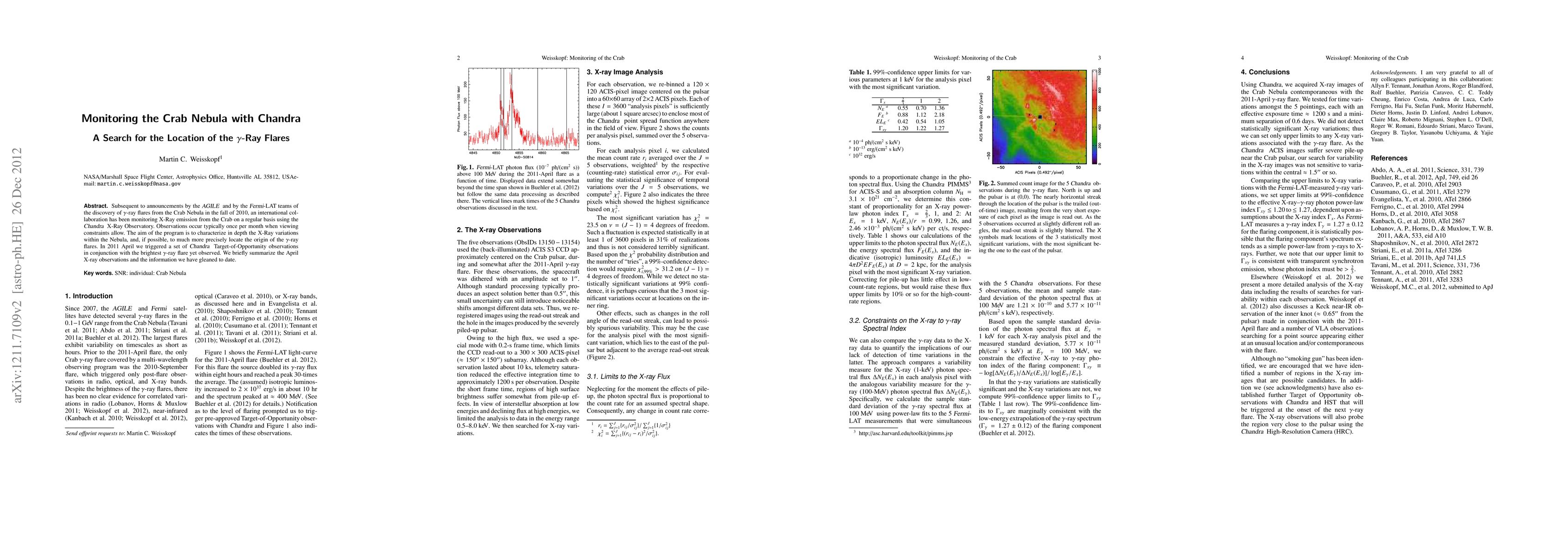 This research monitors the Crab Nebula using the Chandra X-Ray Observatory to study X-ray variations and locate the origins of gamma-ray flares discovered in 2010. The study triggered Chandra observations in April 2011 during the brightest gamma-ray flare, aiming to precisely identify the flare's source.