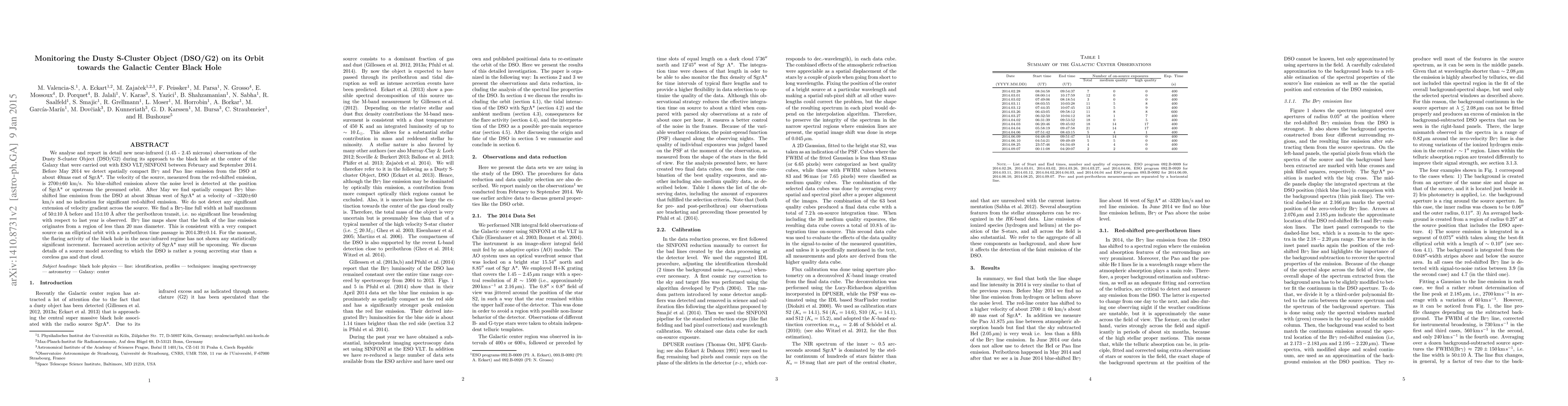 We analyse and report in detail new near-infrared (1.45 - 2.45 microns) observations of the Dusty S-cluster Object (DSO/G2) during its approach to the black hole at the center of the Galaxy that were carried out with ESO VLT/SINFONI between February and September 2014. Before May 2014 we detect spatially compact Br-gamma and Pa-alpha line emission from the DSO at about 40mas east of SgrA*. The velocity of the source, measured from the red-shifted emission, is 2700+-60 km/s. No blue-shifted emission above the noise level is detected at the position of SgrA* or upstream the presumed orbit. After May we find spatially compact Br-gamma blue-shifted line emission from the DSO at about 30mas west of SgrA* at a velocity of -3320+-60 km/s and no indication for significant red-shifted emission. We do not detect any significant extension of velocity gradient across the source. We find a Br-gamma-line full width at half maximum of 50+-10 Angstroem before and 15+-10 Angstroem after the peribothron transit, i.e. no significant line broadening with respect to last year is observed. Br-gamma line maps show that the bulk of the line emission originates from a region of less than 20mas diameter. This is consistent with a very compact source on an elliptical orbit with a peribothron time passage in 2014.39+-0.14. For the moment, the flaring activity of the black hole in the near-infrared regime has not shown any statistically significant increment. Increased accretion activity of SgrA* may still be upcoming. We discuss details of a source model according to which the DSO is rather a young accreting star than a coreless gas and dust cloud.