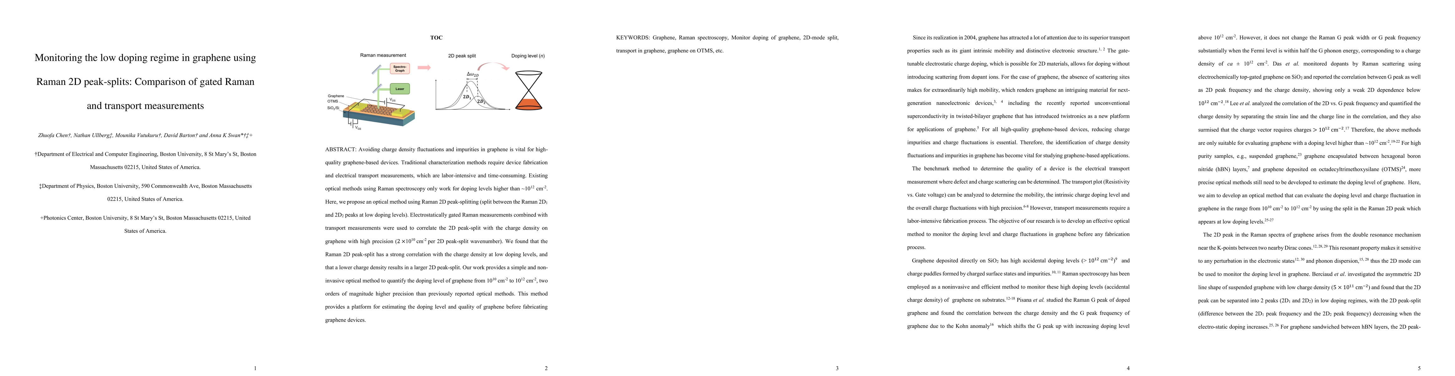 This study proposes a precise optical method using Raman 2D peak-splitting to monitor low doping levels in graphene, correlating it with charge density. The method achieves two orders of magnitude higher precision than previous optical techniques, offering a non-invasive alternative to traditional transport measurements.
