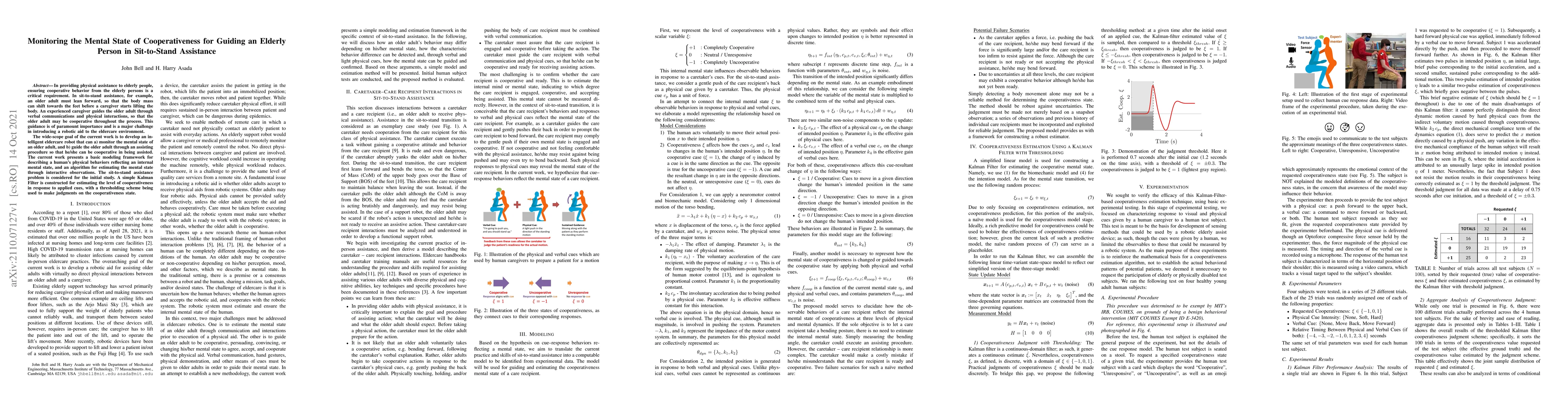This paper develops an intelligent eldercare robot to monitor and guide elderly individuals during sit-to-stand assistance. It presents a modeling framework to estimate the mental state of an older adult through interactive observations, employing a Kalman Filter and thresholding scheme to assess cooperativeness.