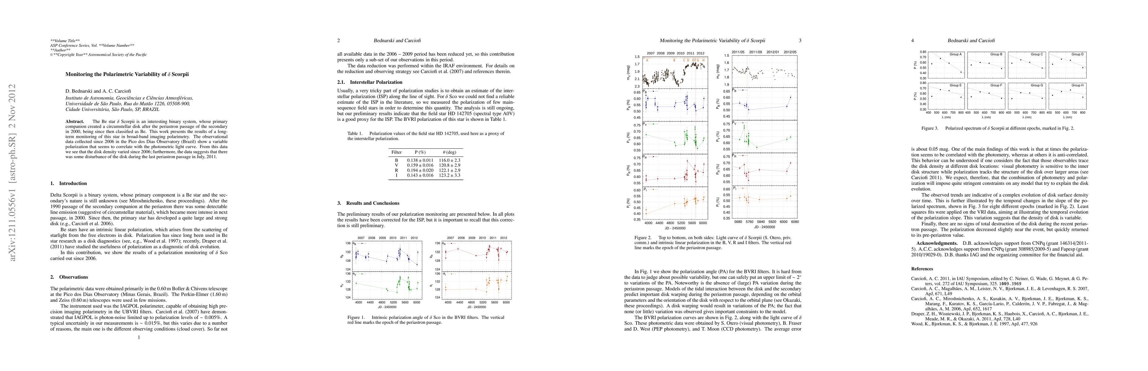 The Be star \delta\ Scorpii is an interesting binary system, whose primary companion created a circumstellar disk after the periastron passage of the secondary in 2000, being since then classified as Be. This work presents the results of a long-term monitoring of this star in broad-band imaging polarimetry. The observational data collected since 2006 in the Pico dos Dias Observatory (Brazil) show a variable polarization that seems to correlate with the photometric light curve. From this data we see that the disk density varied since 2006; furthermore, the data suggests that there was some disturbance of the disk during the last periastron passage in July, 2011.