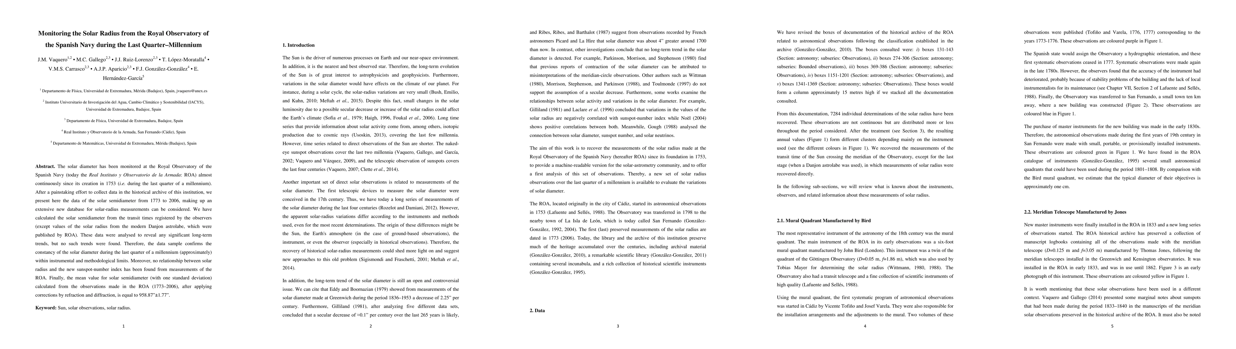 The solar diameter has been monitored at the Royal Observatory of the Spanish Navy (today the Real Instituto y Observatorio de la Armada: ROA) almost continuously since its creation in 1753 (i.e. during the last quarter of a millennium). After a painstaking effort to collect data in the historical archive of this institution, we present here the data of the solar semidiameter from 1773 to 2006, making up an extensive new database for solar-radius measurements can be considered. We have calculated the solar semidiameter from the transit times registered by the observers (except values of the solar radius from the modern Danjon astrolabe, which were published by ROA). These data were analysed to reveal any significant long-term trends, but no such trends were found. Therefore, the data sample confirms the constancy of the solar diameter during the last quarter of a millennium (approximately) within instrumental and methodological limits. Moreover, no relationship between solar radius and the new sunspot-number index has been found from measurements of the ROA. Finally, the mean value for solar semidiameter (with one standard deviation) calculated from the observations made in the ROA (1773-2006), after applying corrections by refraction and diffraction, is equal to 958.87" \pm 1.77"