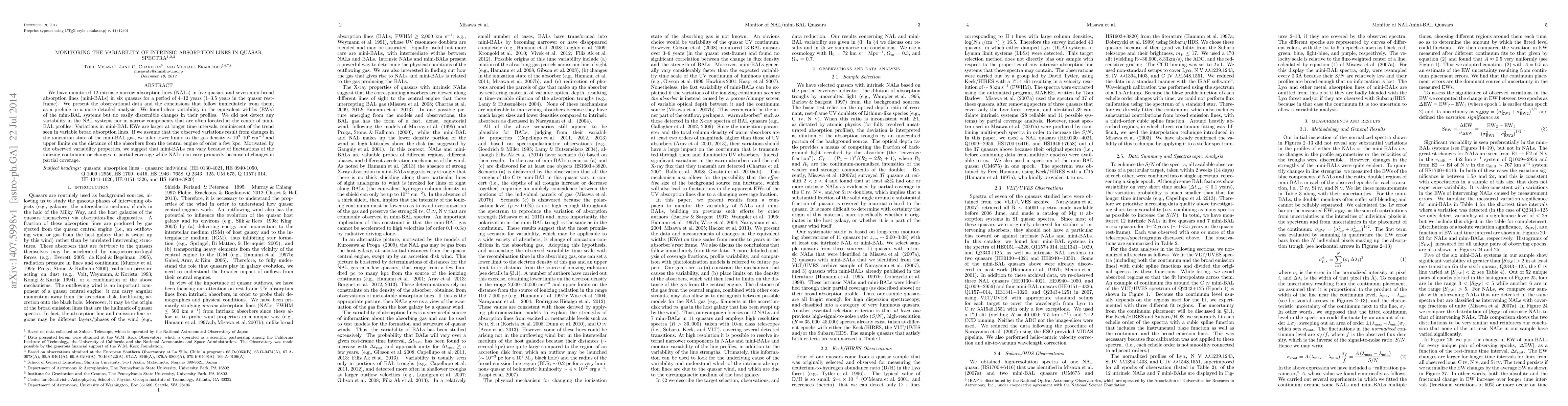 This study monitored intrinsic absorption lines in quasar spectra over several years, finding significant variability in mini-broad absorption lines (mini-BALs) but not in narrow absorption lines (NALs). The observed variations in mini-BALs suggest gas density limits and distances from the central engine, indicating possible fluctuations in the ionizing continuum or changes in partial coverage.