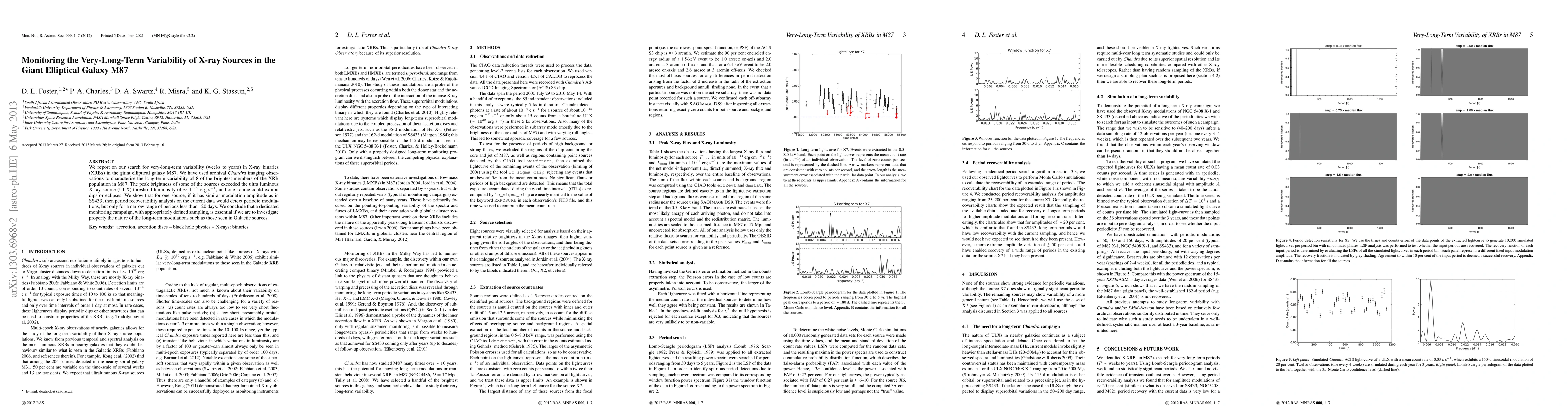We report on our search for very-long-term variability (weeks to years) in X-ray binaries (XRBs) in the giant elliptical galaxy M87. We have used archival Chandra imaging observations to characterise the long-term variability of 8 of the brightest members of the XRB population in M87. The peak brightness of some of the sources exceeded the ultra luminous X-ray source (ULX) threshold luminosity of ~ 10^{39} erg/s, and one source could exhibit dips or eclipses. We show that for one source, if it has similar modulation amplitude as in SS433, then period recoverability analysis on the current data would detect periodic modulations, but only for a narrow range of periods less than 120 days. We conclude that a dedicated monitoring campaign, with appropriately defined sampling, is essential if we are to investigate properly the nature of the long-term modulations such as those seen in Galactic sources.