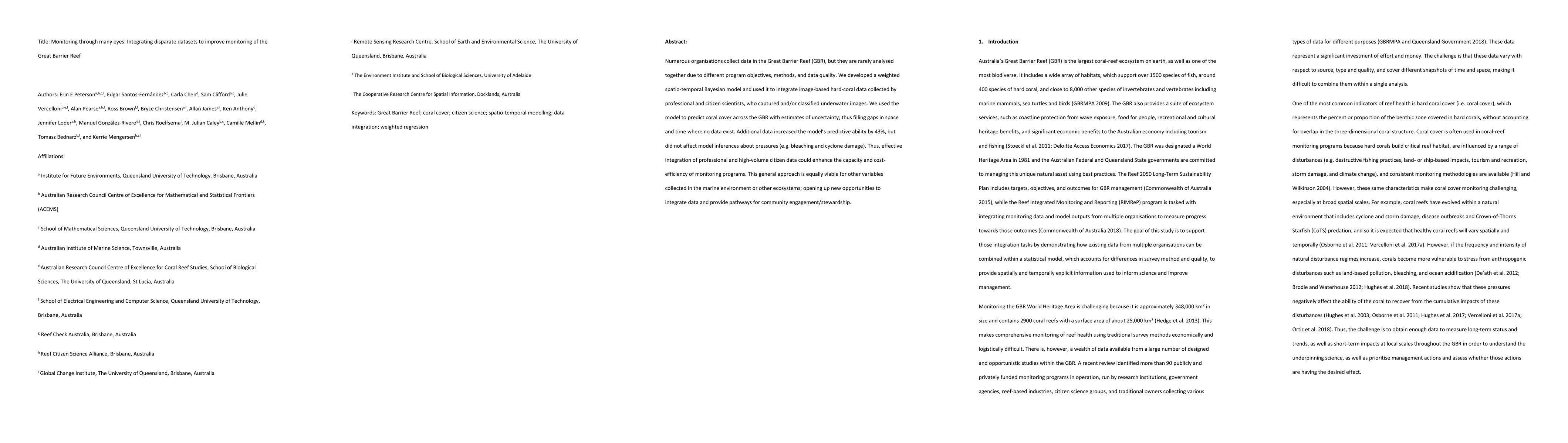 This study developed a weighted spatiotemporal Bayesian model to integrate diverse coral data from professional and citizen scientists, improving the monitoring of the Great Barrier Reef. The model's predictive ability increased by 43% with additional data, demonstrating the potential for enhanced monitoring efficiency and community engagement.