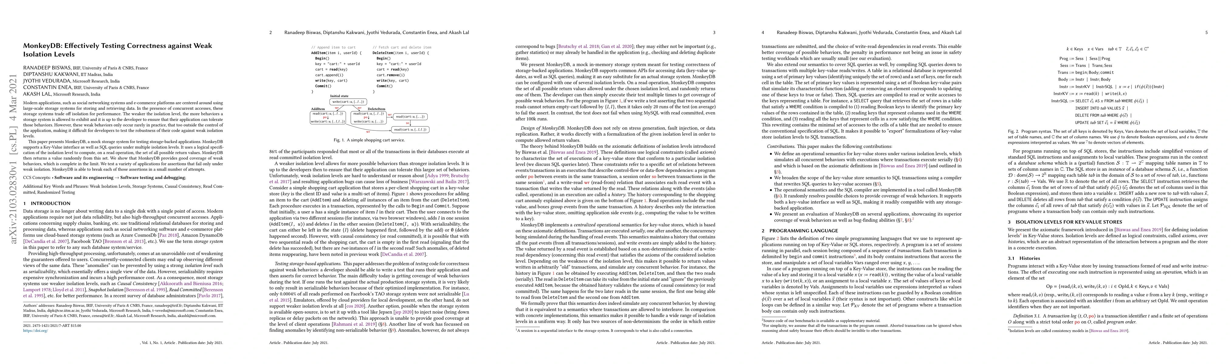 MonkeyDB is a mock storage system designed to test the robustness of storage-backed applications against weak isolation levels. It randomly selects return values from a set of all possible outcomes defined by the isolation level, providing comprehensive coverage of weak behaviors.
