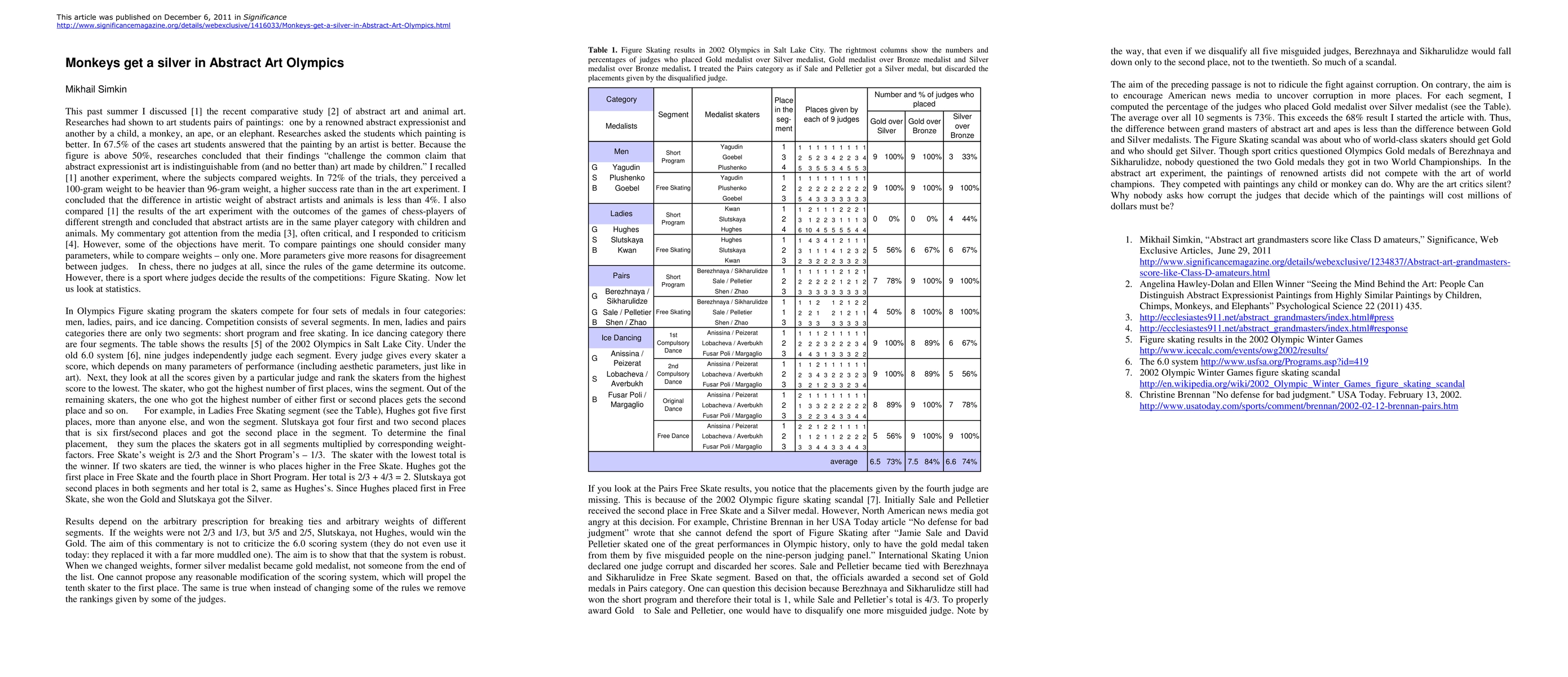 Experiment shows that art students prefer abstract art to monkey art in about two-third of the cases. Since the number is above 50%, some argue that abstract art is different and better than animal art. I compare this result with figure skating competitions, where on average 73% of judges prefer gold medalist to silver medalist. This means that the difference between abstract artists and animal artists is less than the difference between gold and silver medalists.