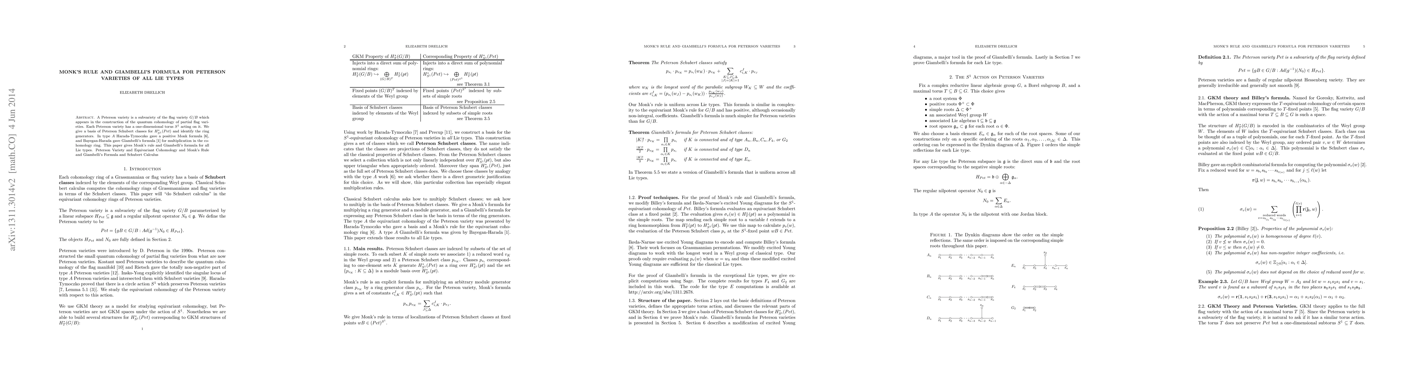 A Peterson variety is a subvariety of the flag variety $G/B$ which appears in the construction of the quantum cohomology of partial flag varieties. Each Peterson variety has a one-dimensional torus $S^1$ acting on it. We give a basis of Peterson Schubert classes for $H_{S^1}^*(Pet)$ and identify the ring generators. In type $A$ Harada-Tymoczko gave a positive Monk formula, and Bayegan-Harada gave Giambelli's formula for multiplication in the cohomology ring. This paper gives Monk's rule and Giambelli's formula for all Lie types.