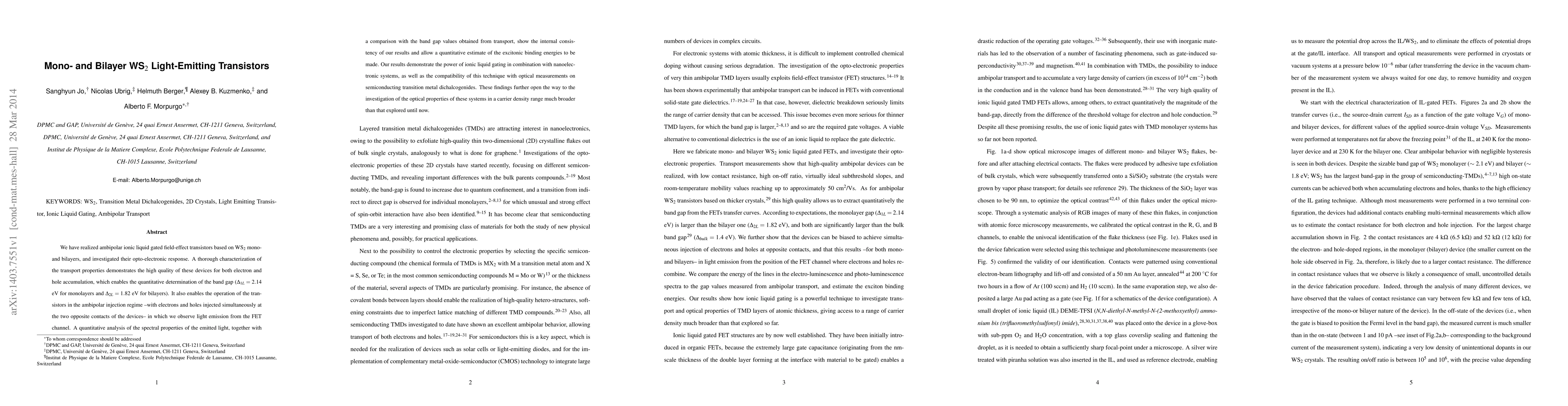 We have realized ambipolar ionic liquid gated field-effect transistors based on WS2 mono- and bilayers, and investigated their opto-electronic response. A thorough characterization of the transport properties demonstrates the high quality of these devices for both electron and hole accumulation, which enables the quantitative determination of the band gap ({\Delta}1L = 2.14 eV for monolayers and {\Delta}2L = 1.82 eV for bilayers). It also enables the operation of the transistors in the ambipolar injection regime with electrons and holes injected simultaneously at the two opposite contacts of the devices in which we observe light emission from the FET channel. A quantitative analysis of the spectral properties of the emitted light, together with a comparison with the band gap values obtained from transport, show the internal consistency of our results and allow a quantitative estimate of the excitonic binding energies to be made. Our results demonstrate the power of ionic liquid gating in combination with nanoelectronic systems, as well as the compatibility of this technique with optical measurements on semiconducting transition metal dichalcogenides. These findings further open the way to the investigation of the optical properties of these systems in a carrier density range much broader than that explored until now.
