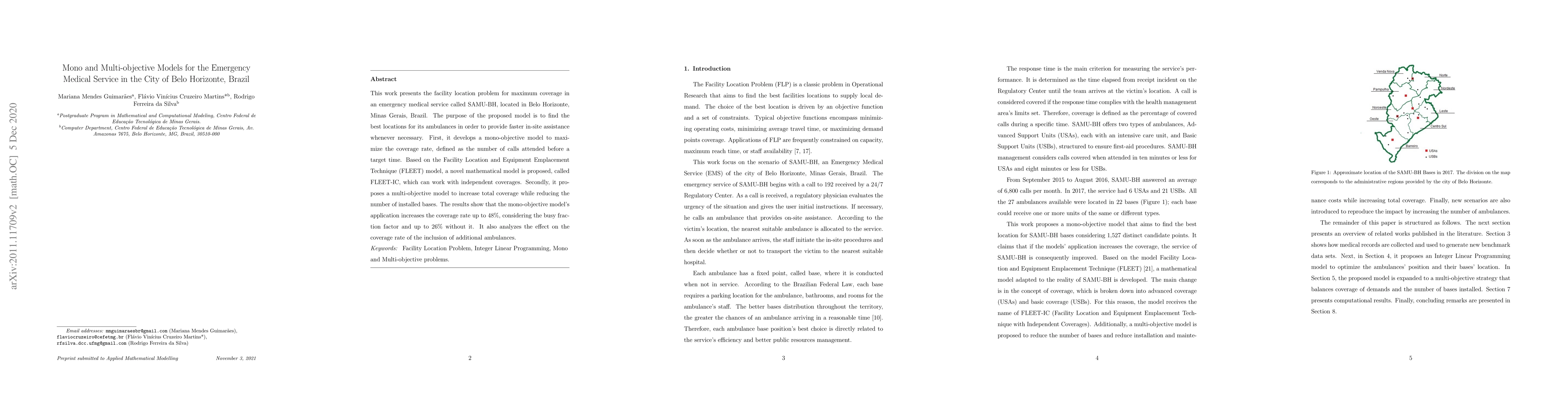 This paper develops models for optimizing ambulance locations in Belo Horizonte's emergency medical service, SAMU-BH, to enhance coverage rates. The mono-objective model, FLEET-IC, boosts coverage by up to 48%, while a multi-objective model aims to maximize coverage while minimizing the number of bases.