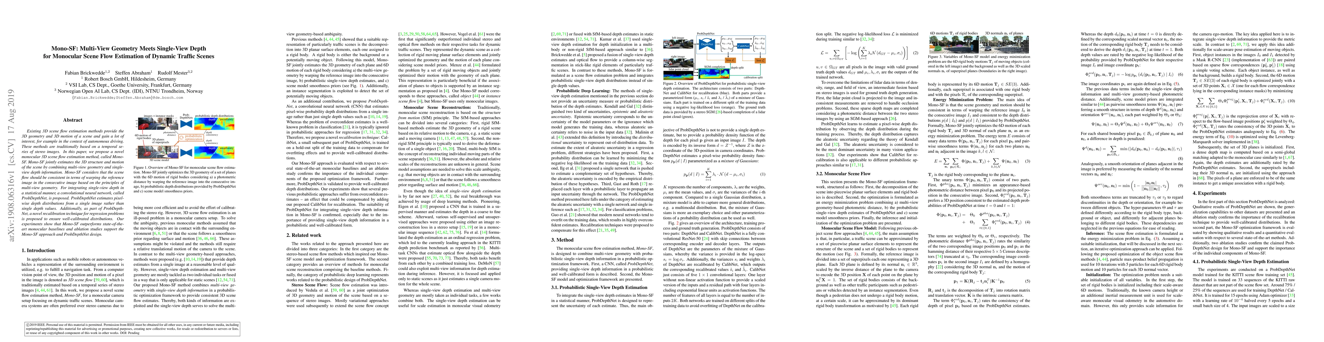 This paper proposes Mono-SF, a novel monocular method for 3D scene flow estimation in dynamic traffic scenes by integrating multi-view geometry and single-view depth information through ProbDepthNet, which estimates pixel-wise depth distributions. Experiments demonstrate Mono-SF's superior performance over existing monocular baselines.