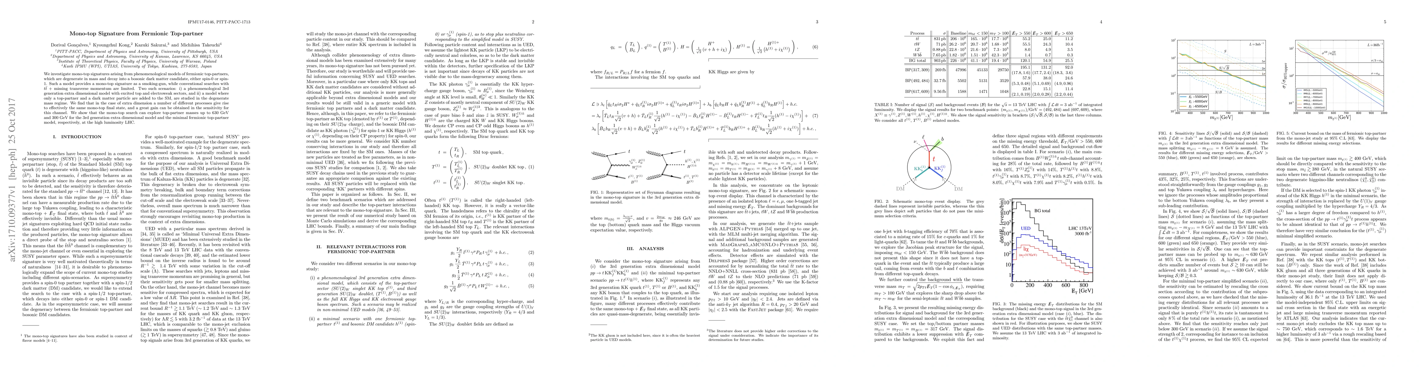 The research investigates mono-top signatures from fermionic top-partners degenerate in mass, decaying into a bosonic dark matter candidate (either spin-0 or spin-1). Two scenarios are studied: a 3rd generation extra-dimensional model and a minimal fermionic top-partner model.