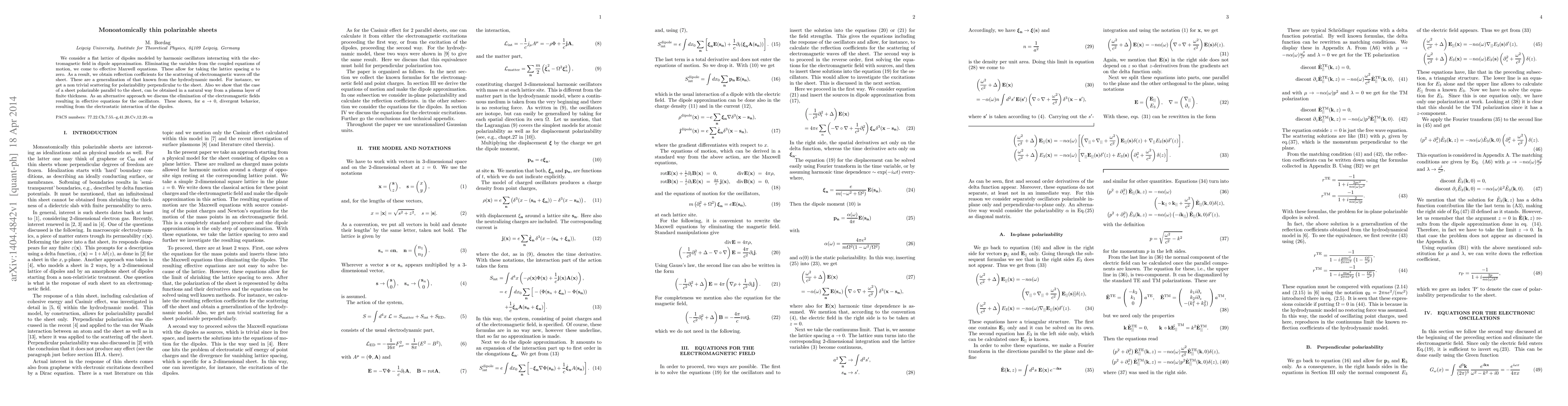 We consider a flat lattice of dipoles modeled by harmonic oscillators interacting with the electromagnetic field in dipole approximation. Eliminating the variables from the coupled equations of motion, we come to effective Maxwell equations. These allow for taking the lattice spacing $a$ to zero. As a result, we obtain reflection coefficients for the scattering of electromagnetic waves off the sheet. These are a generalization of that known from the hydrodynamic model. For instance, we get a non trivial scattering for polarizability perpendicular to the sheet. Also we show that the case of a sheet polarizable parallel to the sheet can be obtained in a natural way from a plasma layer of finite thickness. As an alternative approach we discuss the elimination of the electromagnetic fields resulting in effective equations for the oscillators. These show, for $a\to 0$, divergent behavior, resulting from the electrostatic interaction of the dipoles.