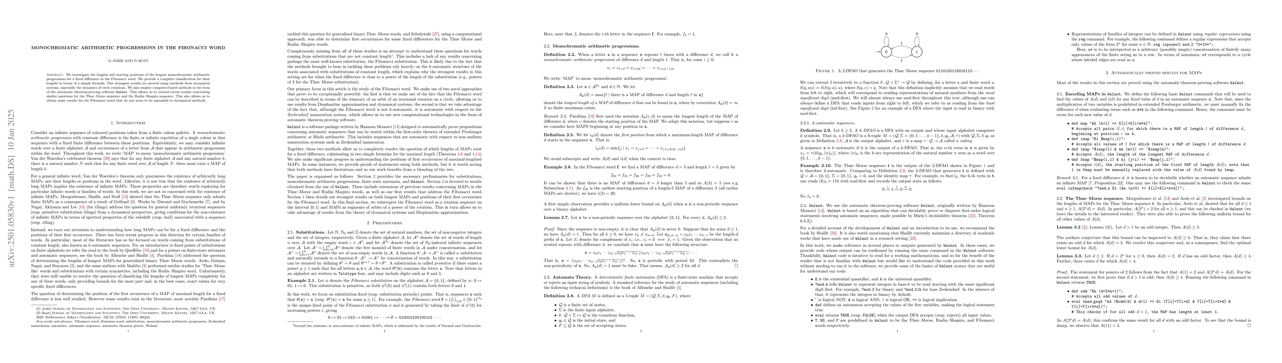 This paper classifies the longest monochromatic arithmetic progressions in the Fibonacci word by analyzing their lengths and starting positions, using methods from dynamical systems and automatic theorem-proving software to extend findings from similar sequences. The results are achieved via circle rotation dynamics and computer-based techniques.