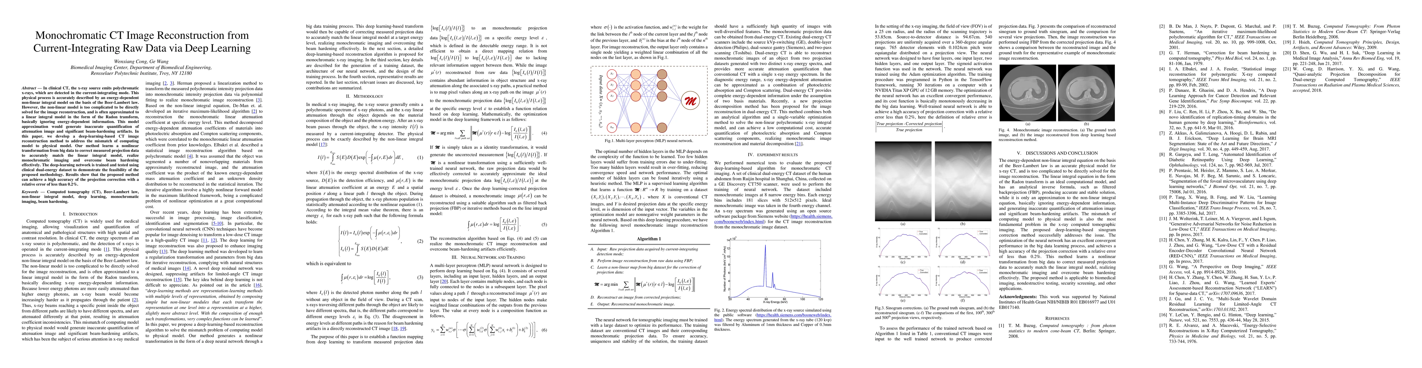 This paper proposes a deep-learning-based method for reconstructing monochromatic CT images from current-integrating data, addressing the mismatch between the complex physical model and the linear Radon transform approximation. The deep learning network corrects measured projection data to achieve accurate monochromatic imaging and reduce beam hardening artifacts.