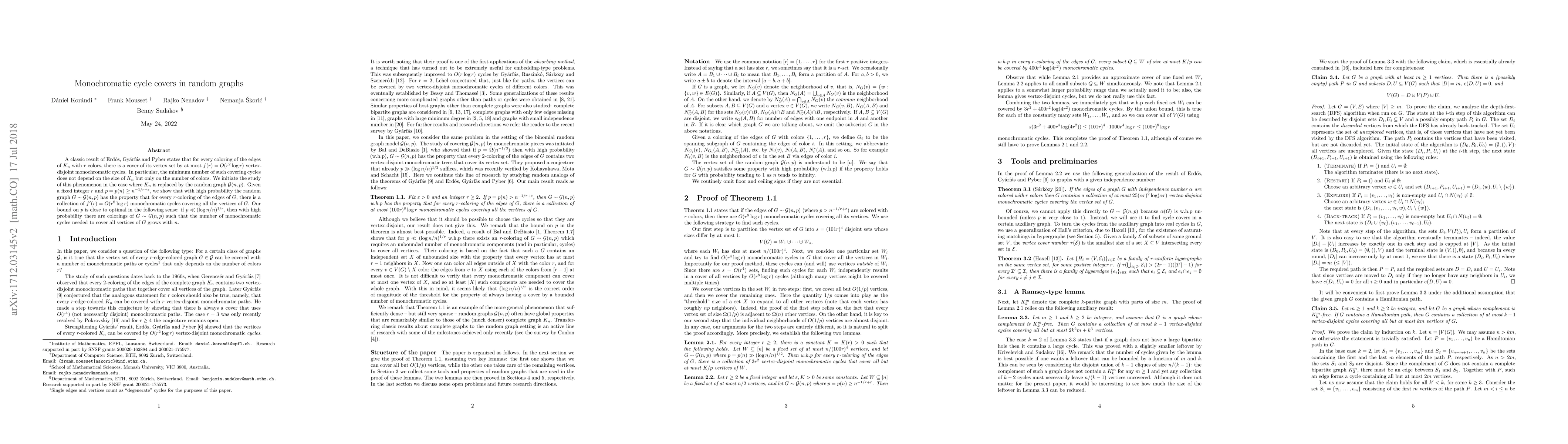 A classic result of Erd\H{o}s, Gy\'arf\'as and Pyber states that for every coloring of the edges of $K_n$ with $r$ colors, there is a cover of its vertex set by at most $f(r) = O(r^2 \log r)$ vertex-disjoint monochromatic cycles. In particular, the minimum number of such covering cycles does not depend on the size of $K_n$ but only on the number of colors. We initiate the study of this phenomena in the case where $K_n$ is replaced by the random graph $\mathcal G(n,p)$. Given a fixed integer $r$ and $p =p(n) \ge n^{-1/r + \varepsilon}$, we show that with high probability the random graph $G \sim \mathcal G(n,p)$ has the property that for every $r$-coloring of the edges of $G$, there is a collection of $f'(r) = O(r^8 \log r)$ monochromatic cycles covering all the vertices of $G$. Our bound on $p$ is close to optimal in the following sense: if $p\ll (\log n/n)^{1/r}$, then with high probability there are colorings of $G\sim\mathcal G(n,p)$ such that the number of monochromatic cycles needed to cover all vertices of $G$ grows with $n$.