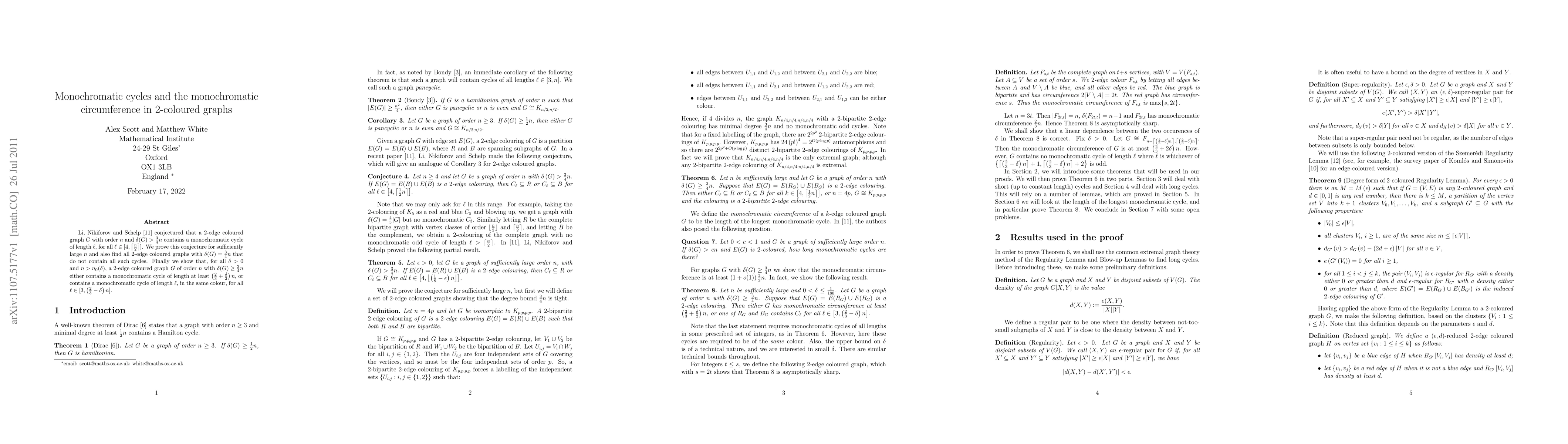 This paper proves the conjecture by Li, Nikiforov, and Schelp for large graphs, showing that a 2-edge coloured graph with minimal degree greater than 3n/4 contains a monochromatic cycle of every length from 4 to n/2. It also identifies specific graphs with minimal degree exactly 3n/4 lacking such cycles.